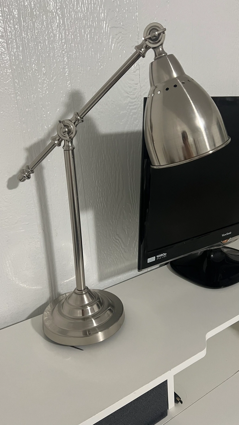 175Silver desk lamp with adjustable arms. Comes with a bulb in yellow light.