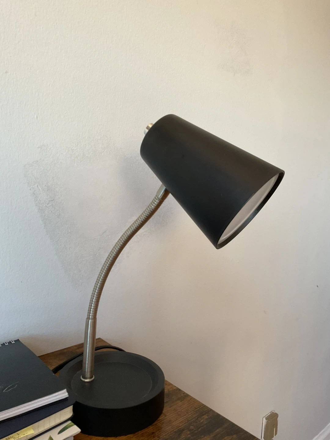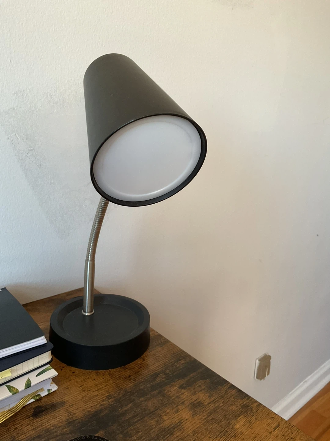 77Selling a sleek black desk lamp! It's in great condition and perfect for any workspace or bedside table. The flexible gooseneck design allows you to adjust the light exactly where you need it. The lamp has a modern look that fits well with any decor