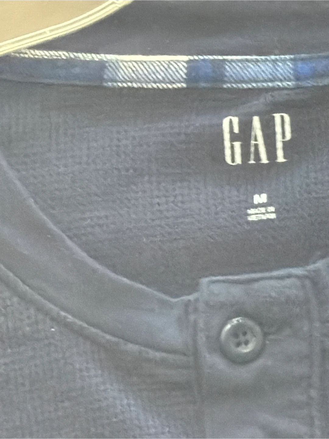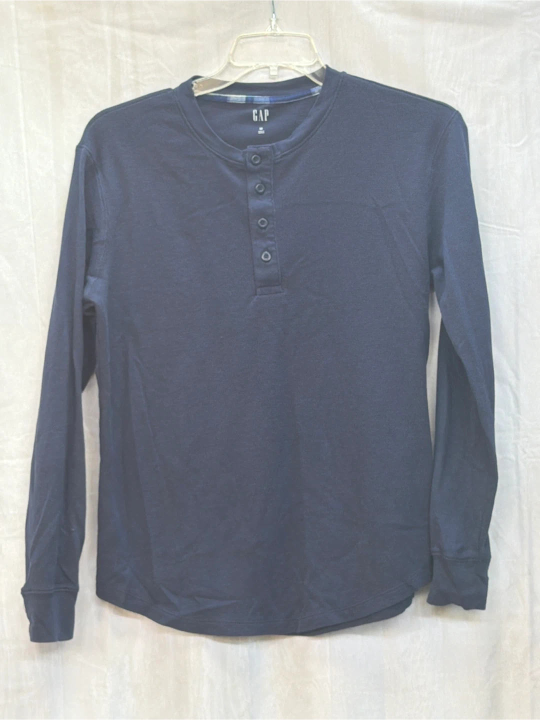 This is a navy blue long sleeve henley shirt from GAP. It's a size medium. The shirt has a button placket at the neck.