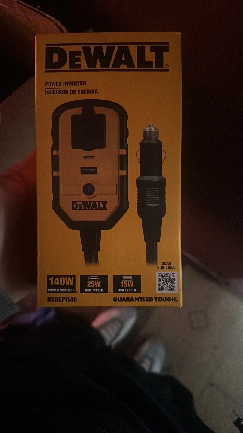 Selling a DEWALT 140W Power Inverter, model DXAEP1140. It features a 25W USB Type-C port and a 15W USB Type-A port. It's guaranteed tough!