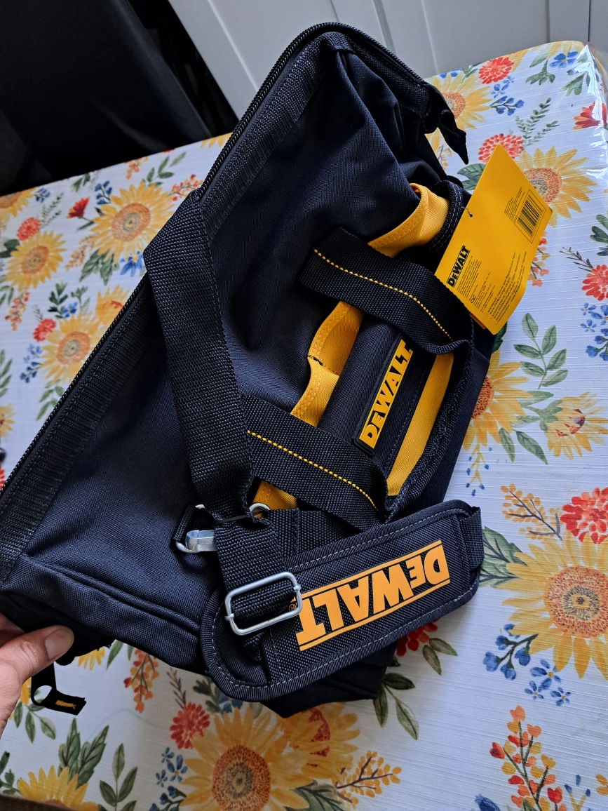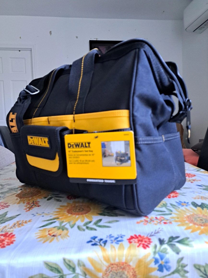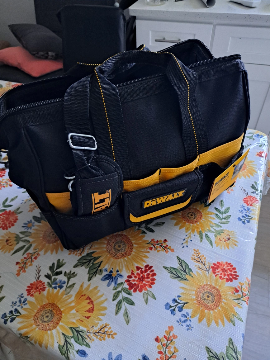 I'm selling a DeWalt 16"Tradesman's Tool Bag, It's in great condition and ready to help you carry your tools! The bag features a black and yellow color scheme, providing a stylish and functional way to organize your equipment