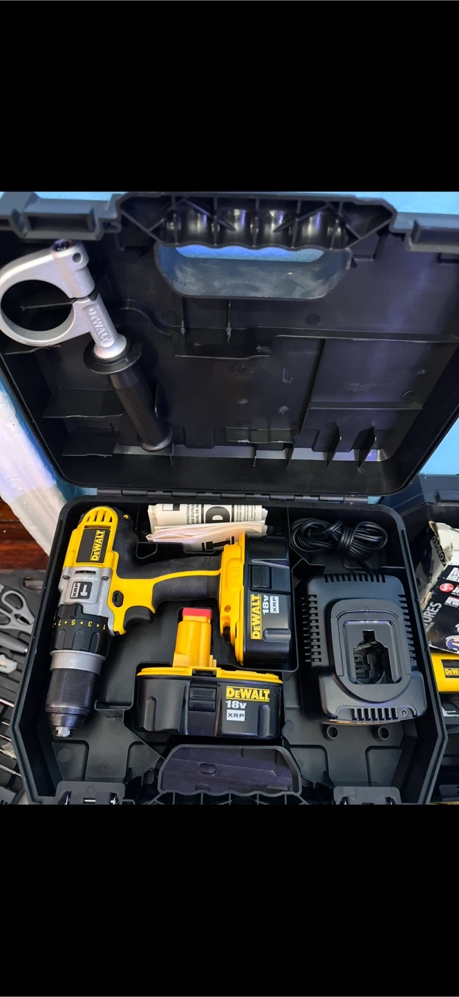10Selling a DeWalt 18V XRP drill kit that comes with its original case. Includes the drill, two 18V batteries, a charger, and an auxiliary handle. Great for various drilling and fastening tasks!