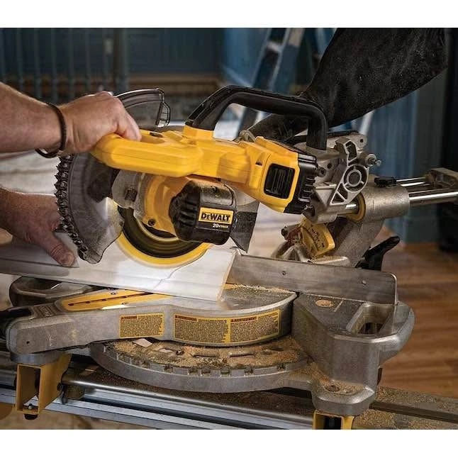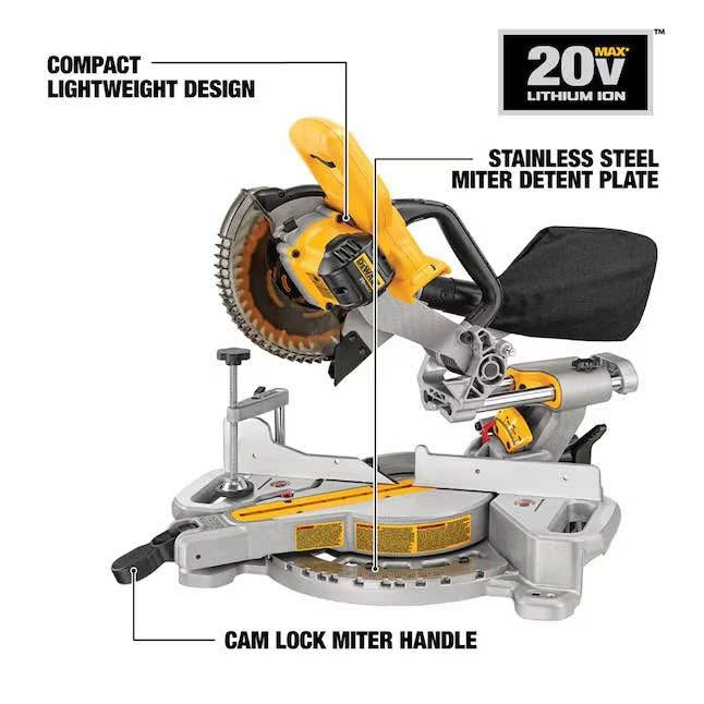 65The DCS361B 20V MAX* 7-1/4-in sliding miter saw features an adjustment free cut line indication for better accuracy and visibility. Adjustable stainless steel miter detent plate with 11 positive stops improves productivity and ensures cutting accuracy. Compact and lightweight construction for easy transporting and storage. Includes DCS361 7-1/4-in (184mm) cordless sliding compound miter saw, carbide blade, blade wrench, dust bag, and material clamp Integrated cut line cross-cut positioning system provides adjustment-free cut line indication for better accuracy and visibility Capacity to cut up to 3-5/8-in nested crown and 3-1/2-in base vertically Adjustable stainless steel miter detent plate with 11 positive stops improves productivity and ensures cutting accuracy Oversized bevel scale makes bevel angle adjustments accurate and easy Compact, lightweight design (30-lbs) allows for easy transport and storage Cam lock miter handle delivers quick and accurate miter angles Precise miter system and machined base fence support optimize durability and cutting accuracy Battery and charger sold separately