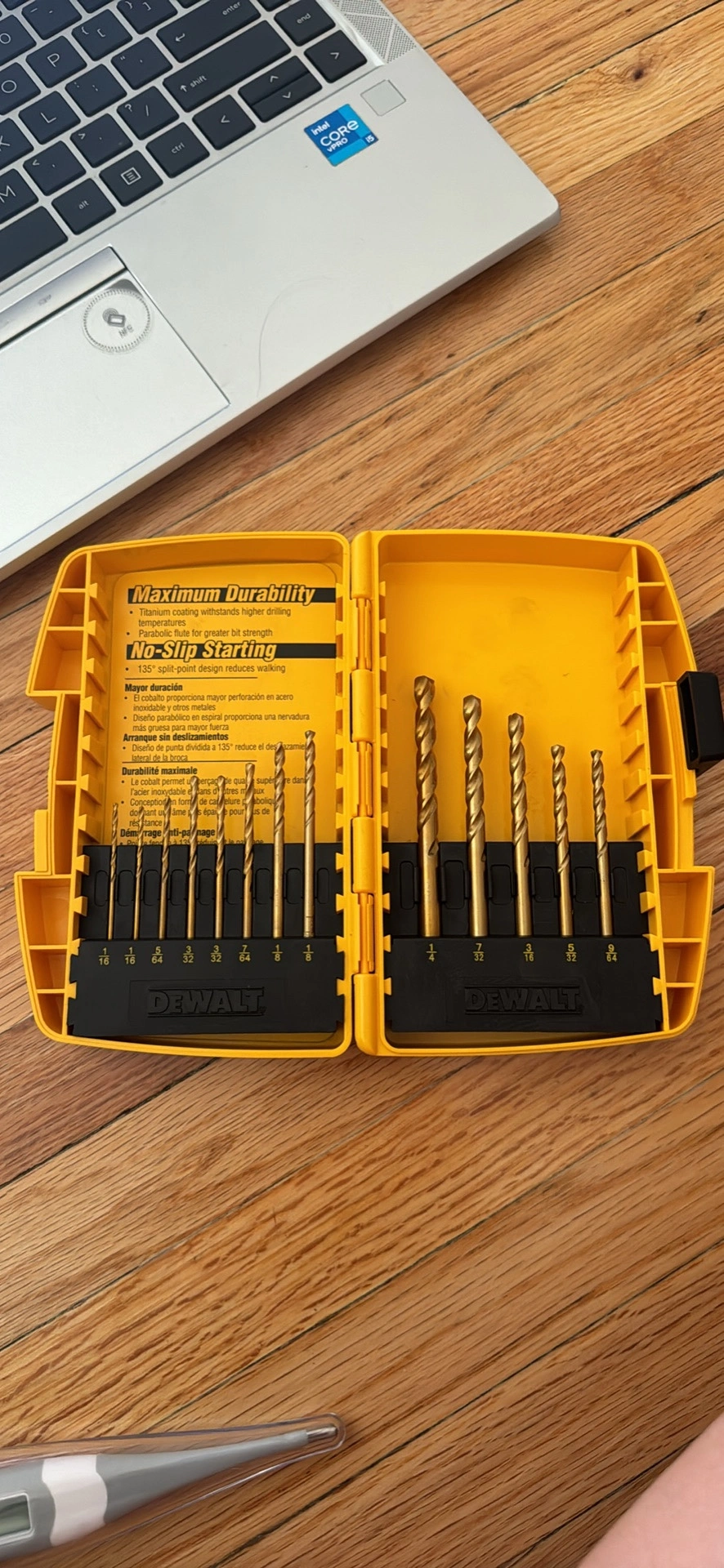 Set of 13 drill bits in a yellow plastic case.