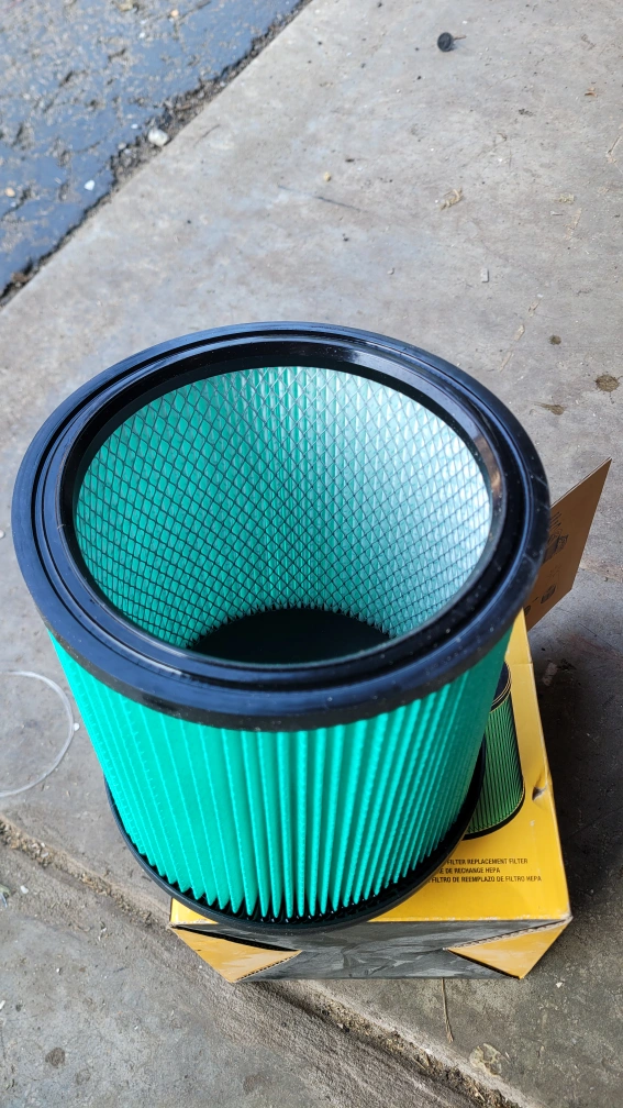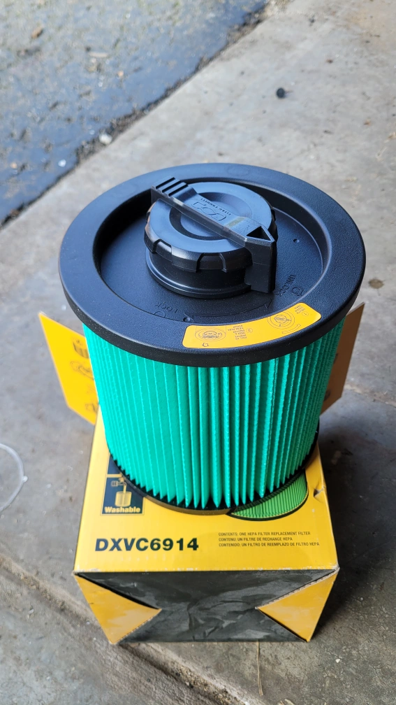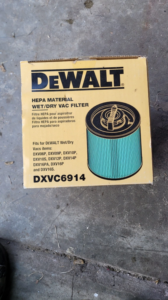 Selling a DeWalt HEPA material wet/dry vac filter. It fits DEWALT wet/dry vacs items: DXV06P, DXV09P, DXV10P, DXV10S, DXV12P, DXV14P, DXV16PA, DXV16P and DXV16S. Model number is DXVC6914. It's washable and comes with the original box!
