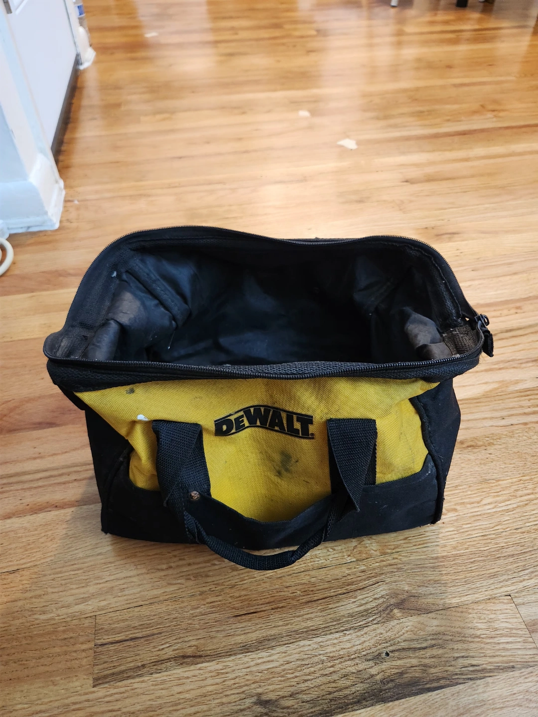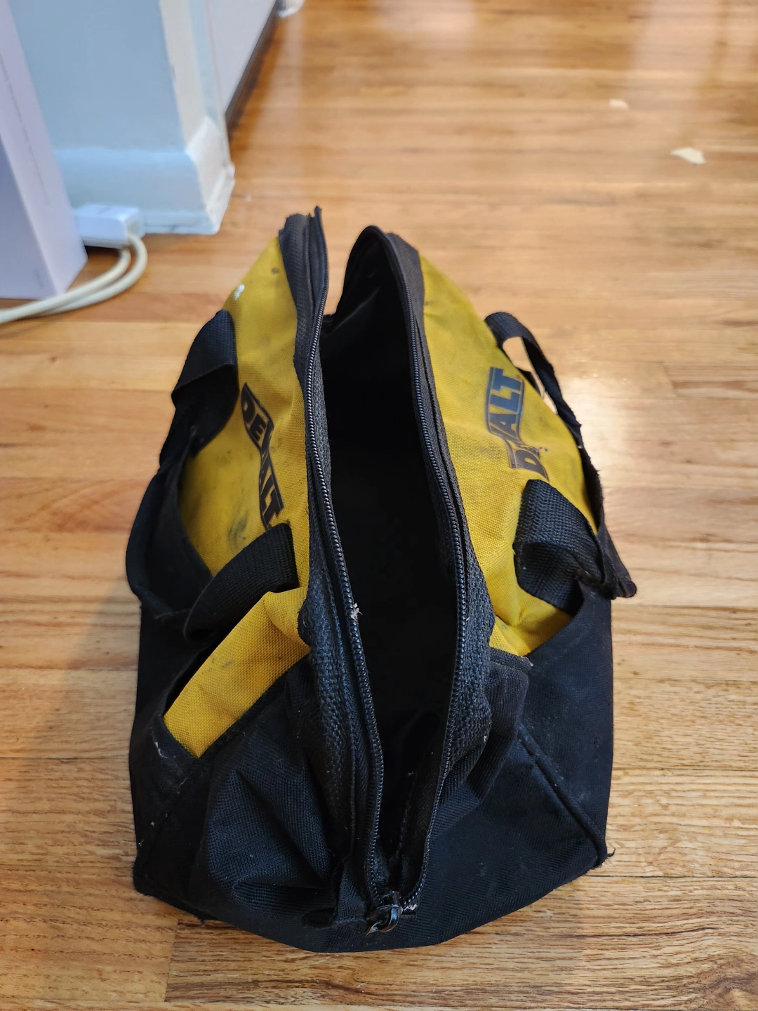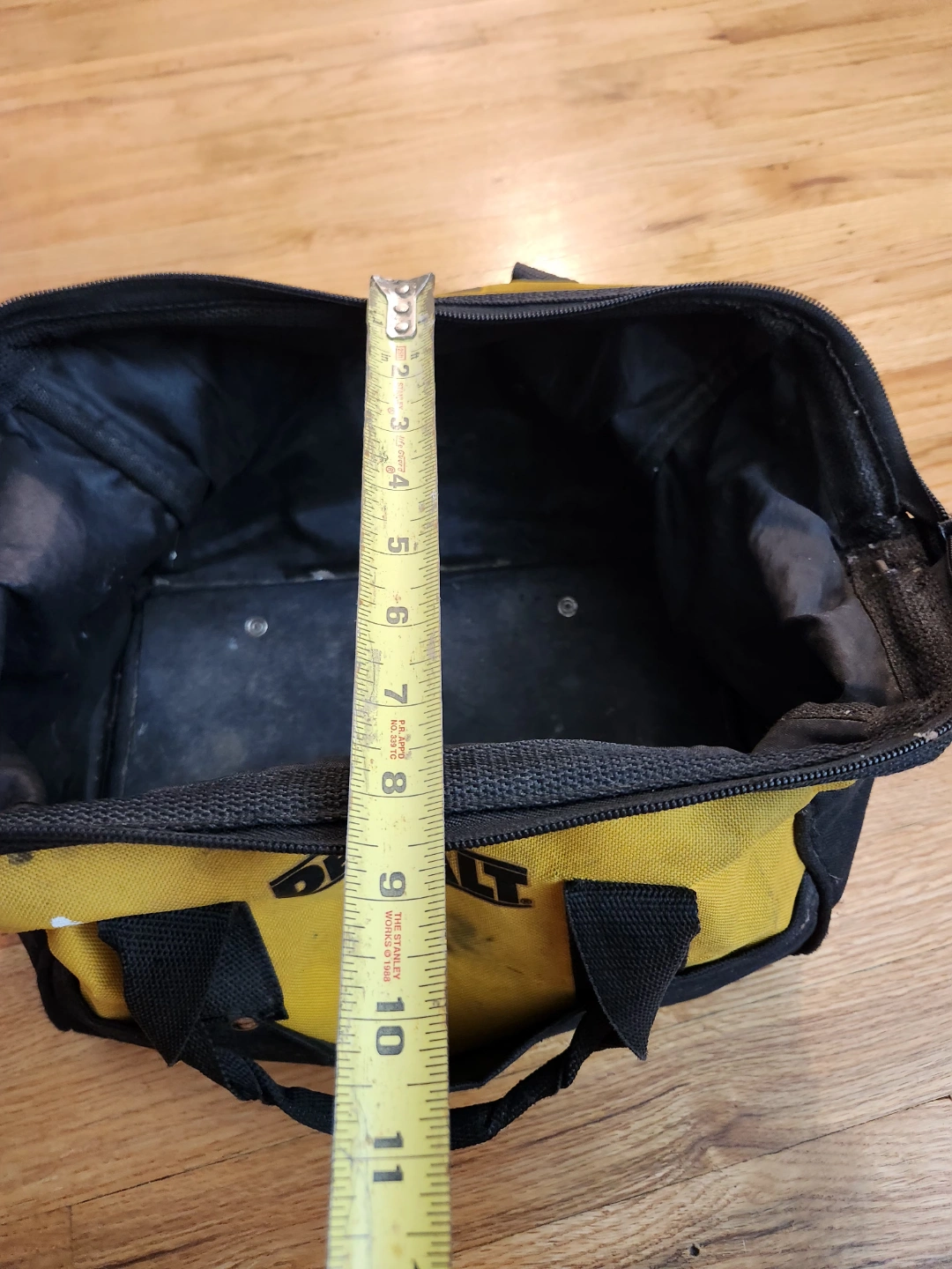 150Black and yellow tool bag. Made of fabric. Features two handles. zipper handle is broken but replaceable. Using this bag can help organize your belongings.