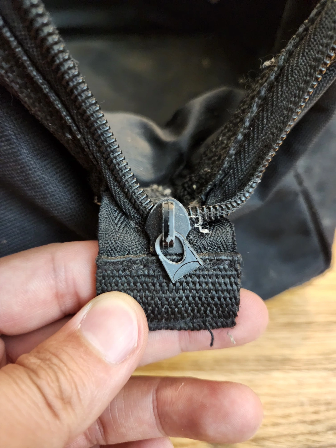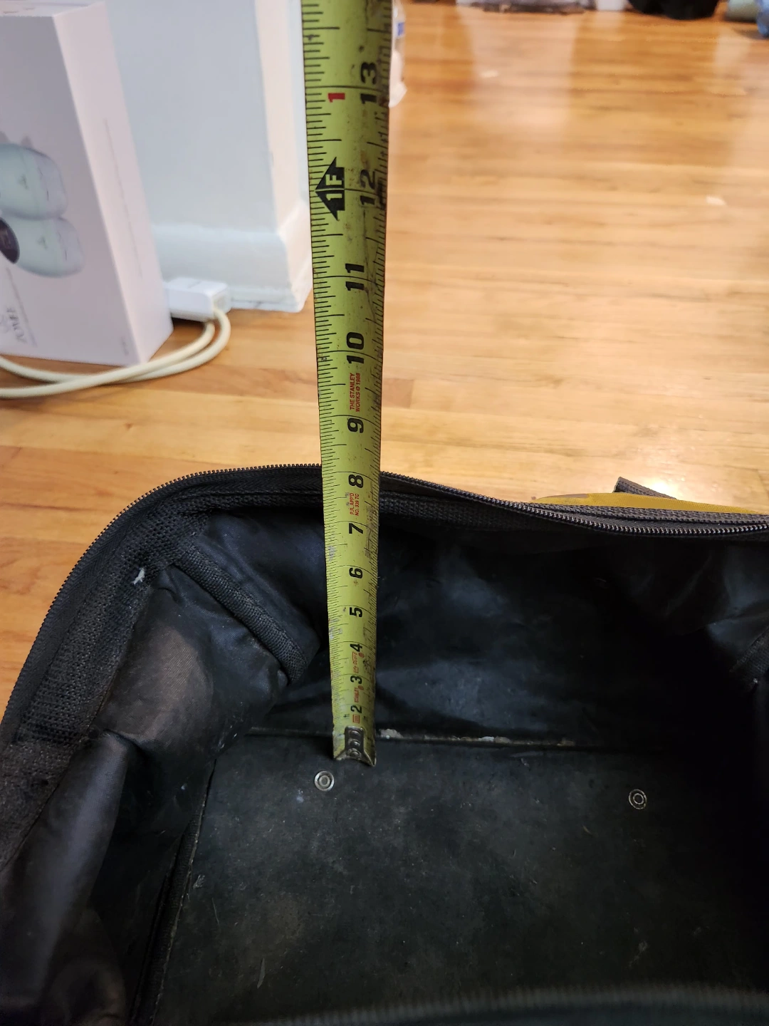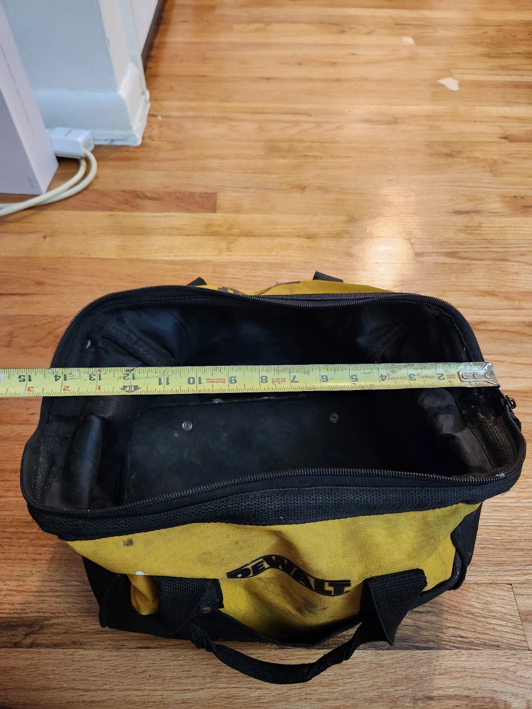 150Black and yellow tool bag. Made of fabric. Features two handles. zipper handle is broken but replaceable. Using this bag can help organize your belongings.