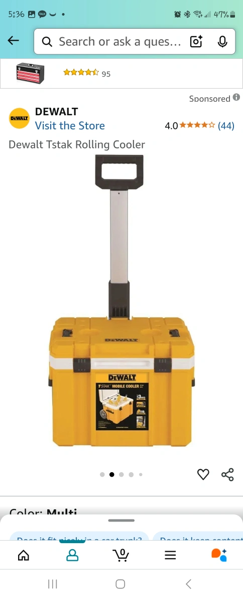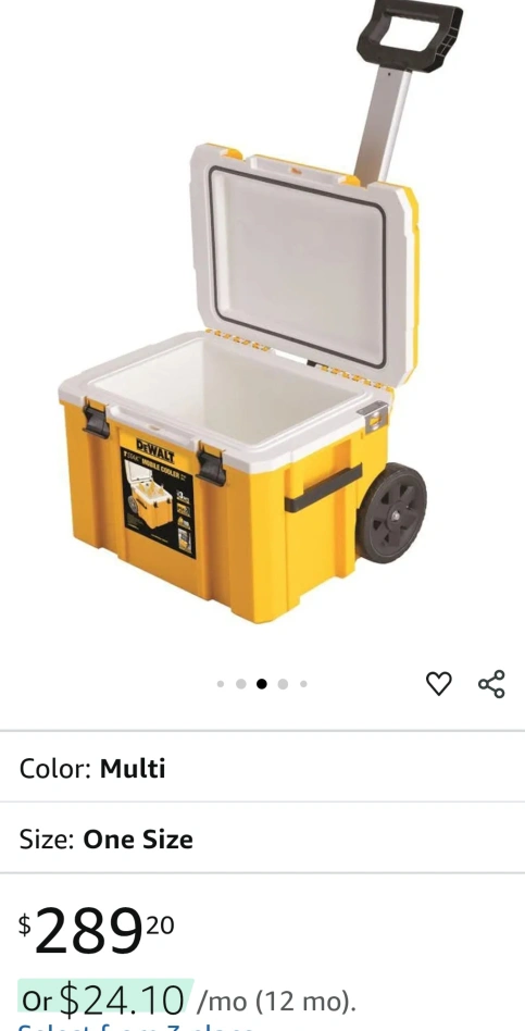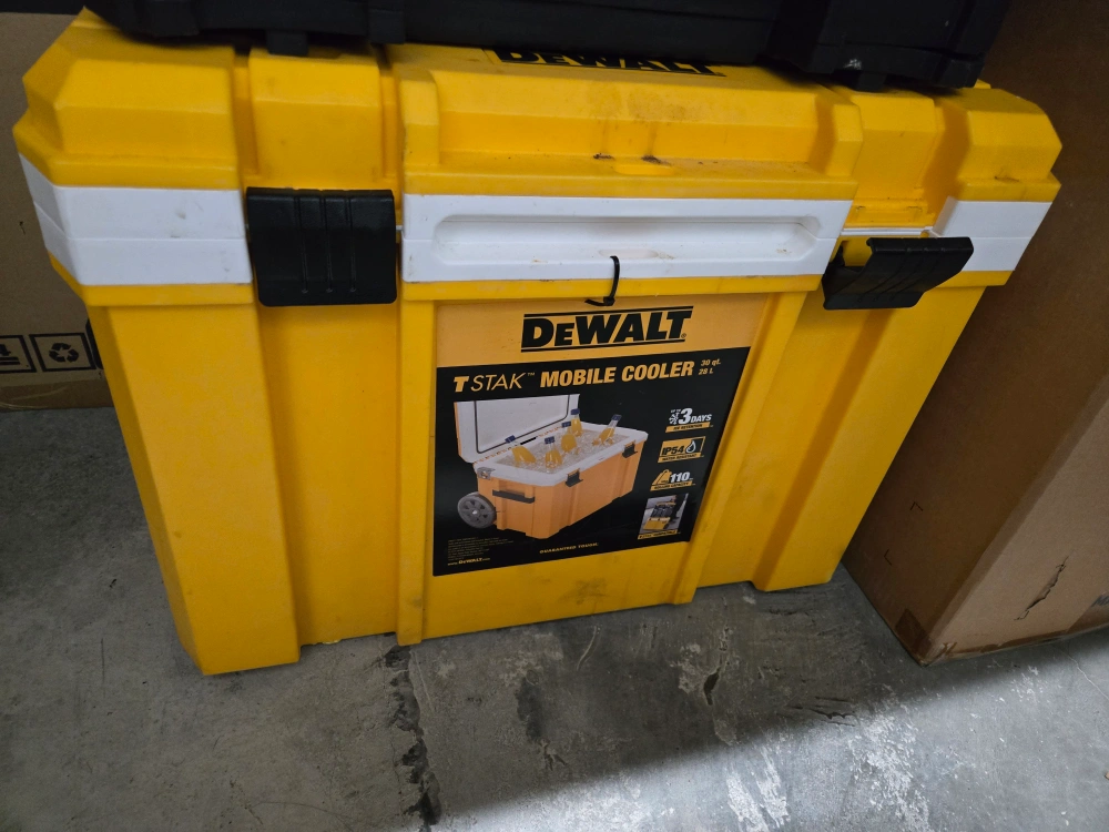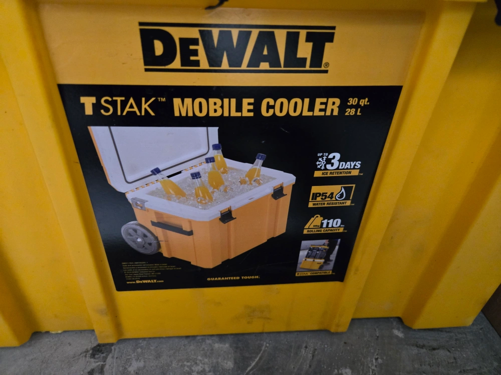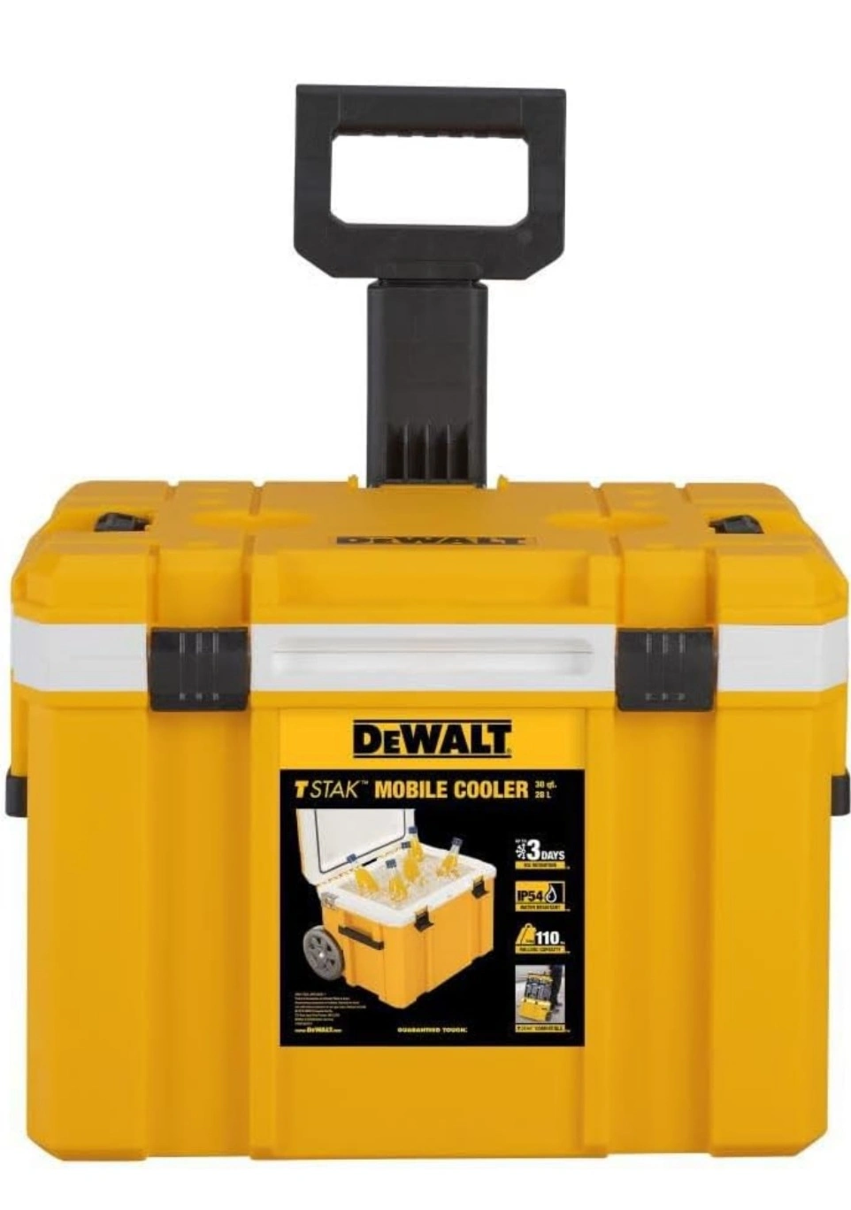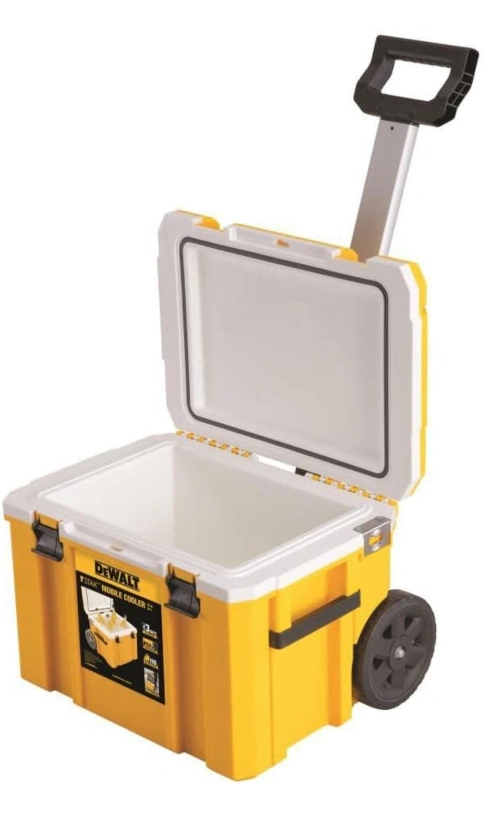 868Durable rolling cooler. Yellow and white. Large capacity. Telescoping handle. Wheels for easy transport.