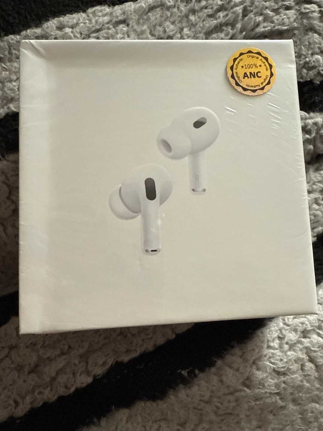 Apple AirPods Pro (2nd generation) with MagSafe Charging Case (USB-C). Includes earphones and charging case. Made in China.