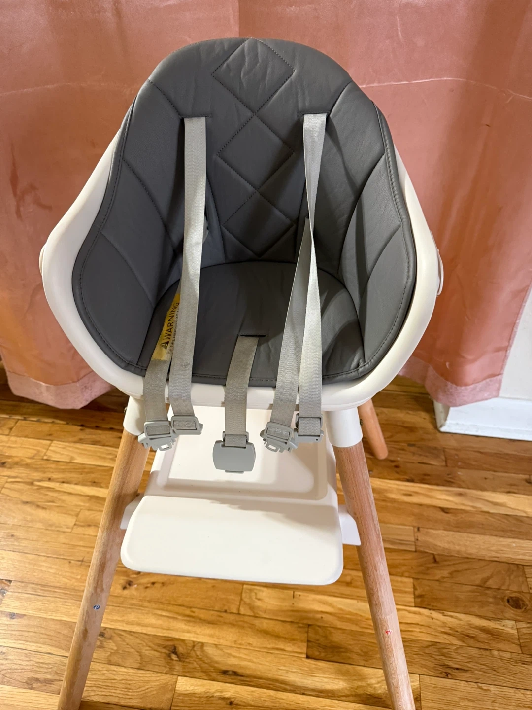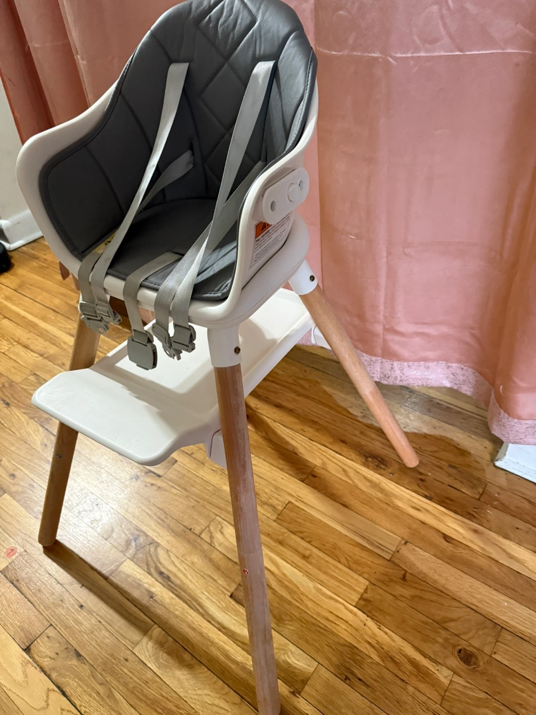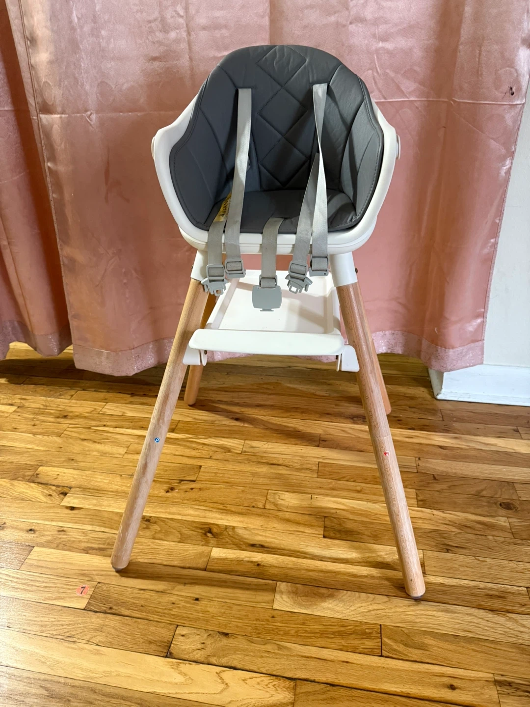 Selling a Tadpoles high chair in great condition! It features a gray padded seat and a white frame with wooden legs. This stylish and functional high chair is perfect for your little one's mealtime.