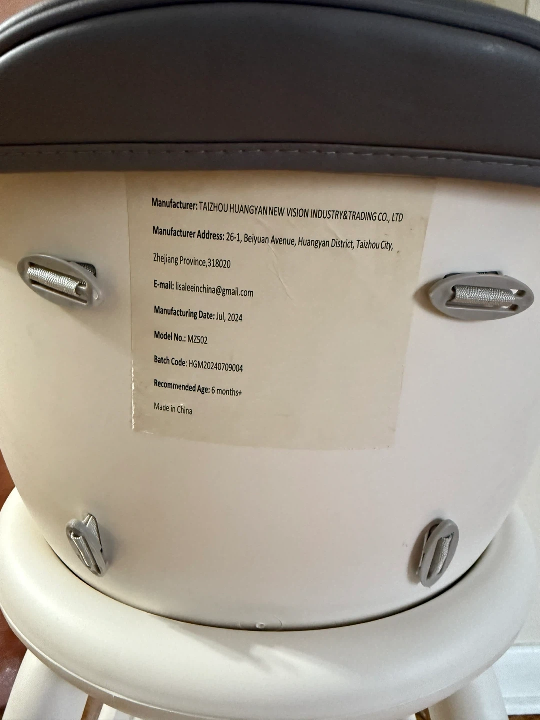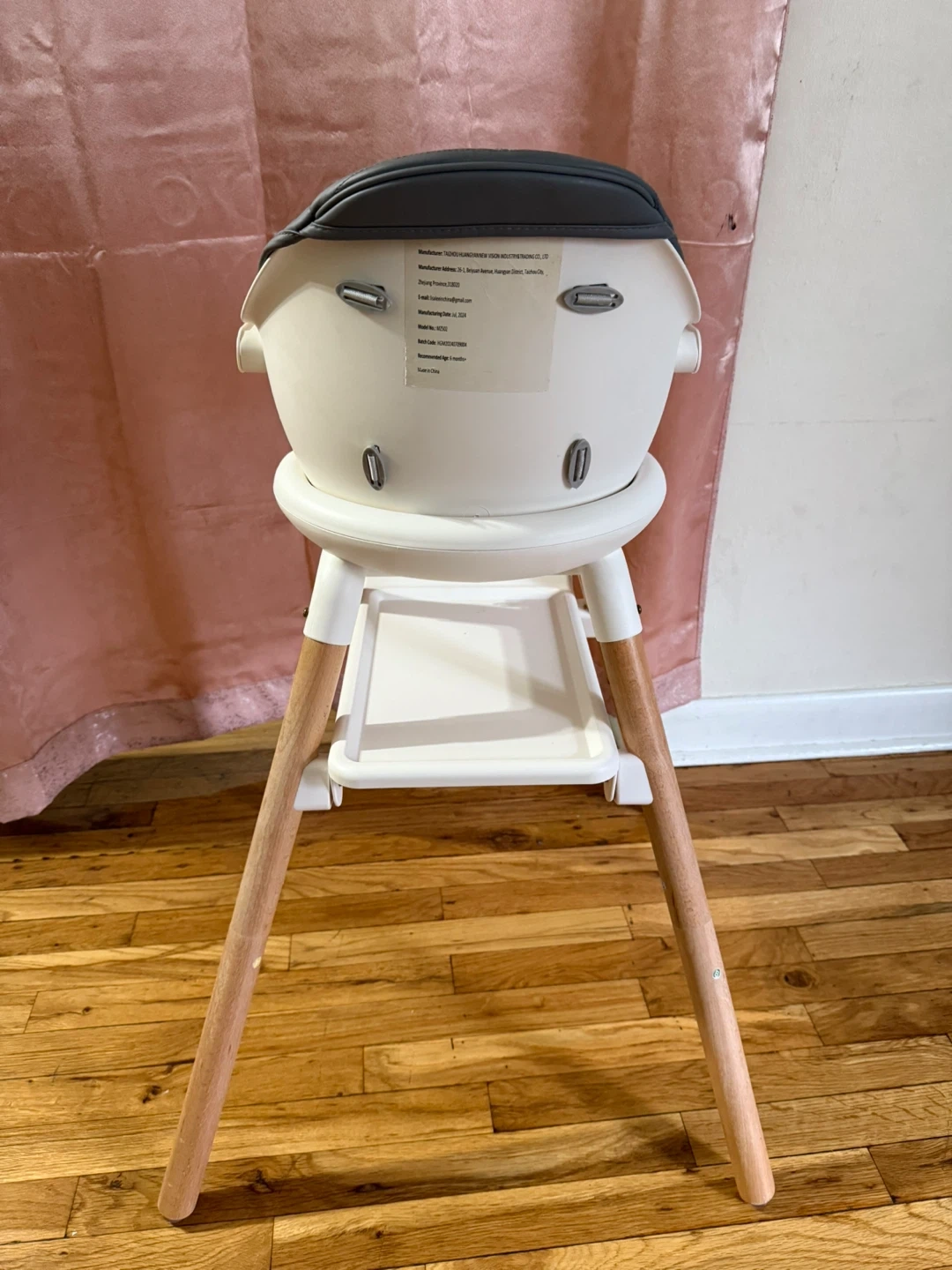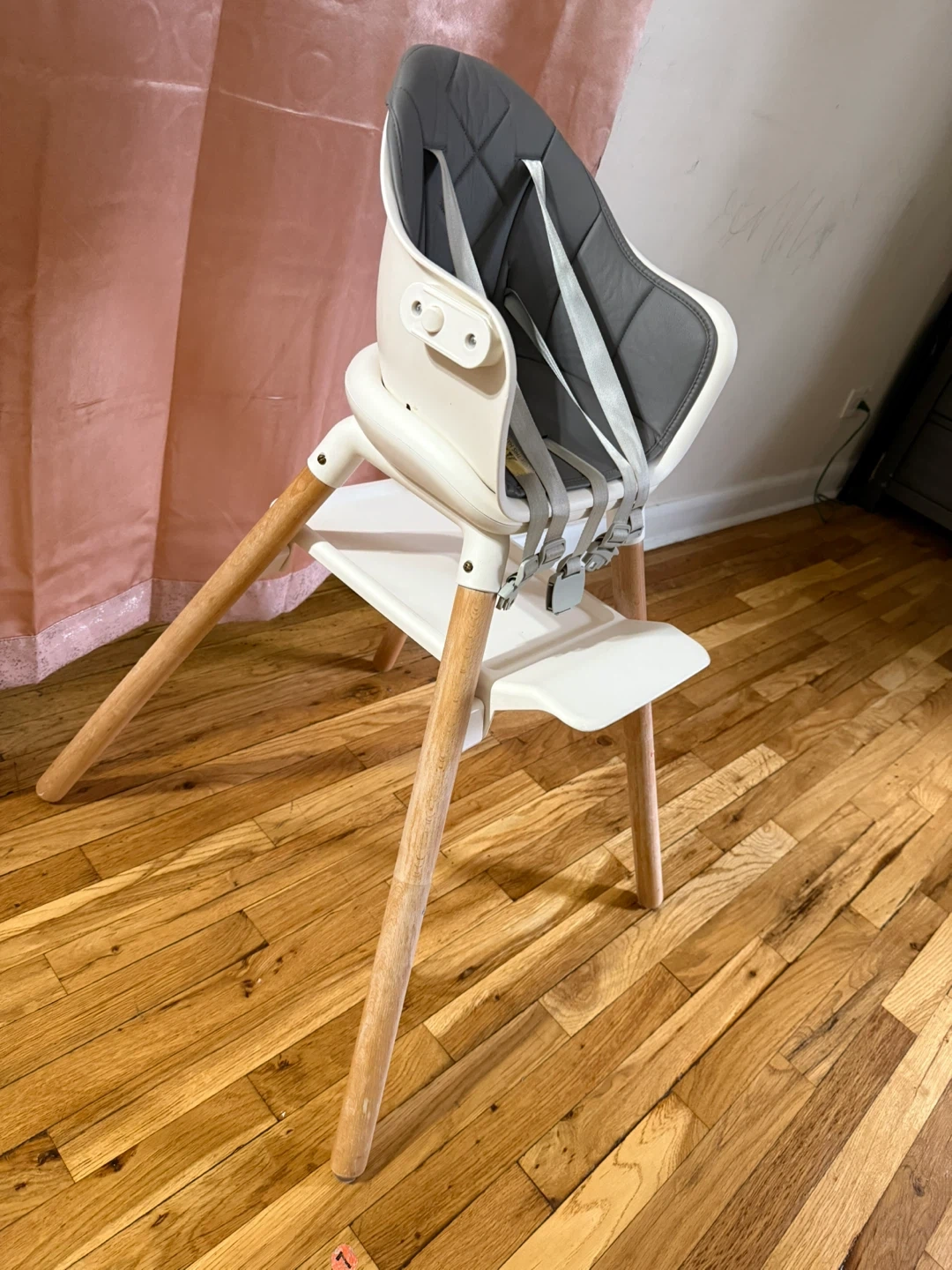 Selling a Tadpoles high chair in great condition! It features a gray padded seat and a white frame with wooden legs. This stylish and functional high chair is perfect for your little one's mealtime.
