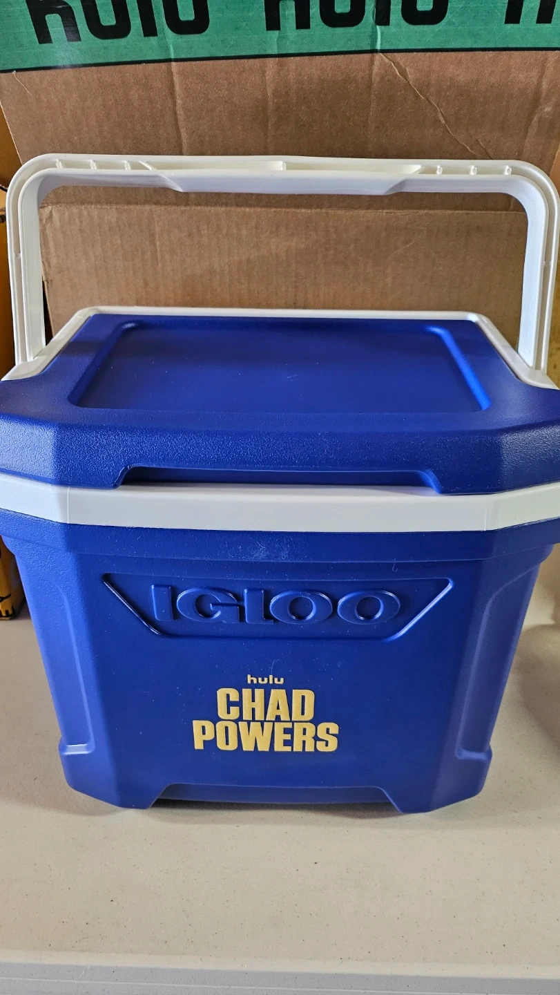 This is a blue Igloo cooler with "Hulu Chad Powers" printed on the front. It's a medium-sized cooler with a white handle and lid trim. Perfect for keeping drinks and snacks cold!