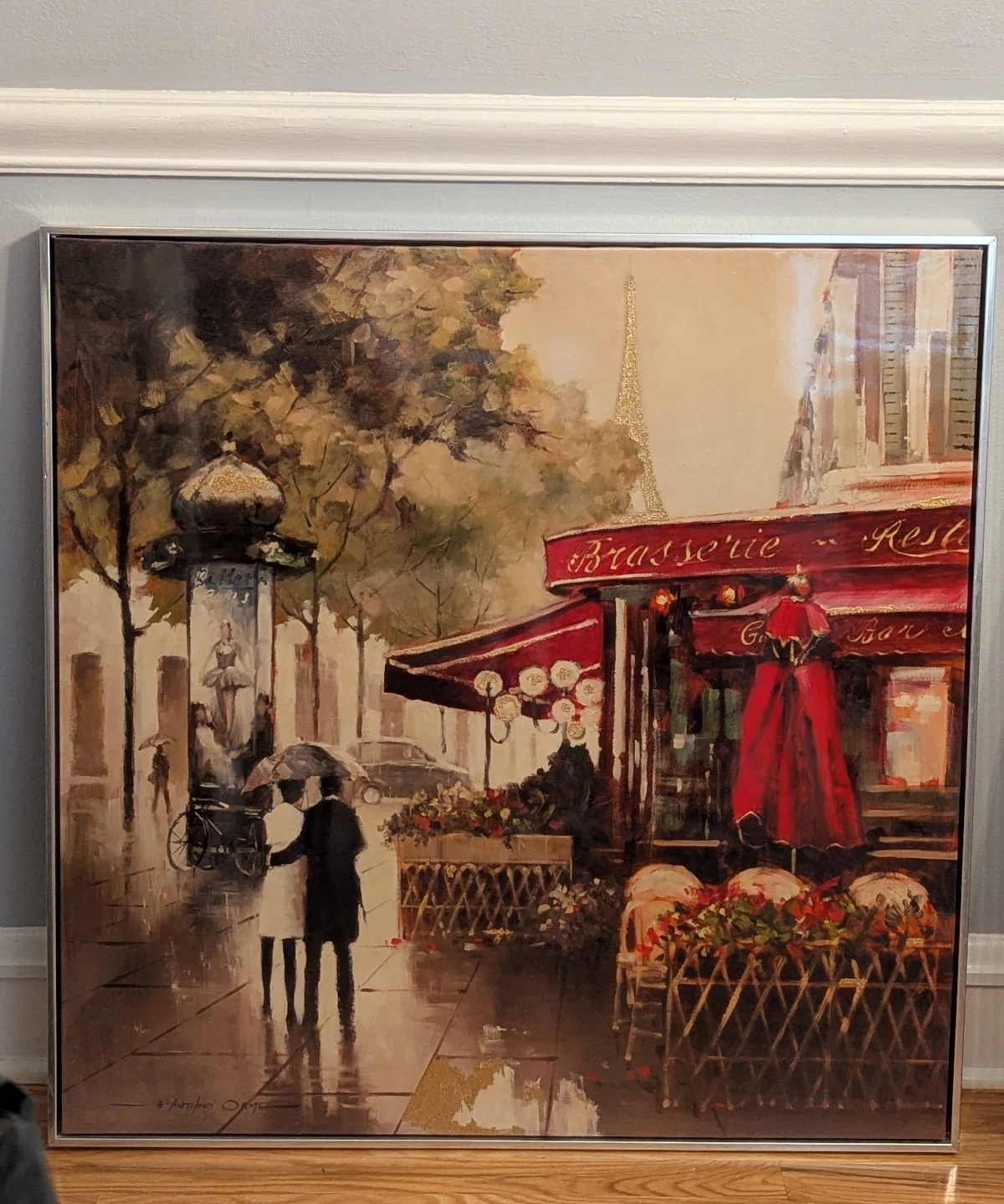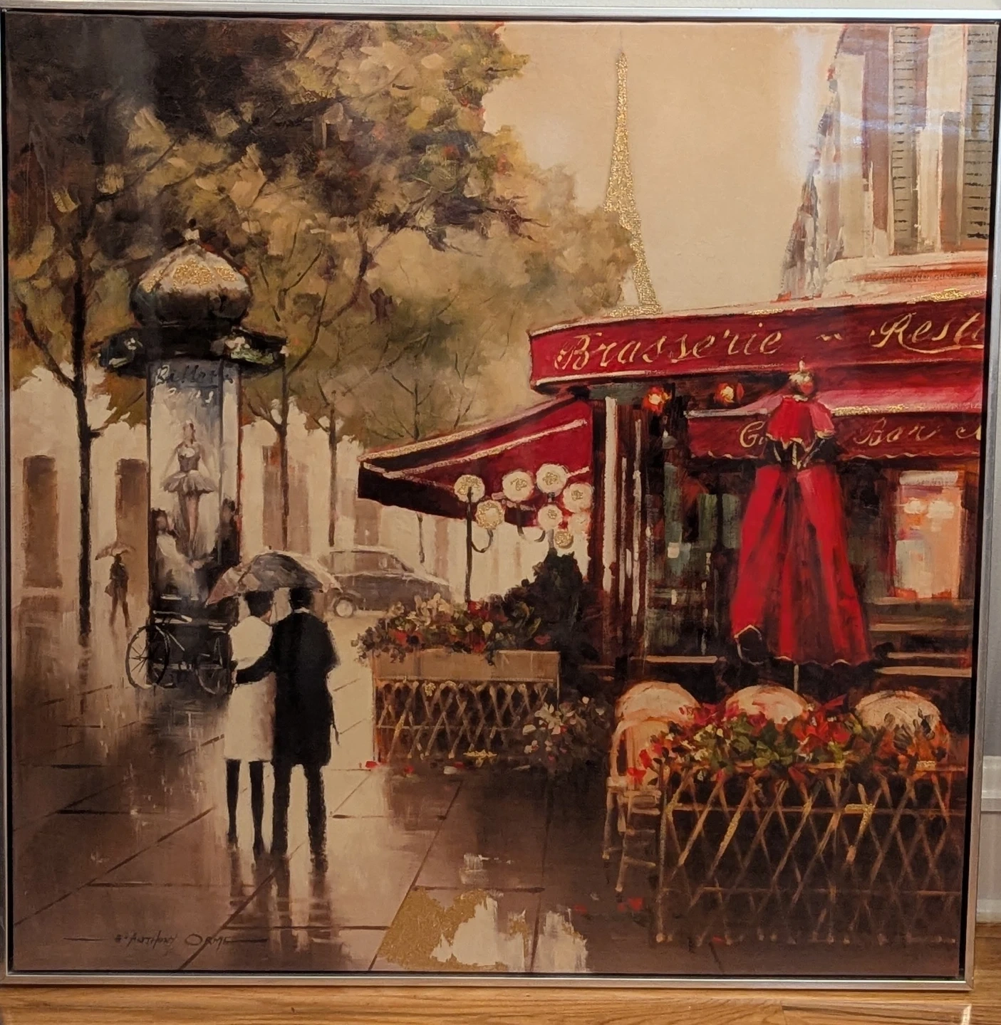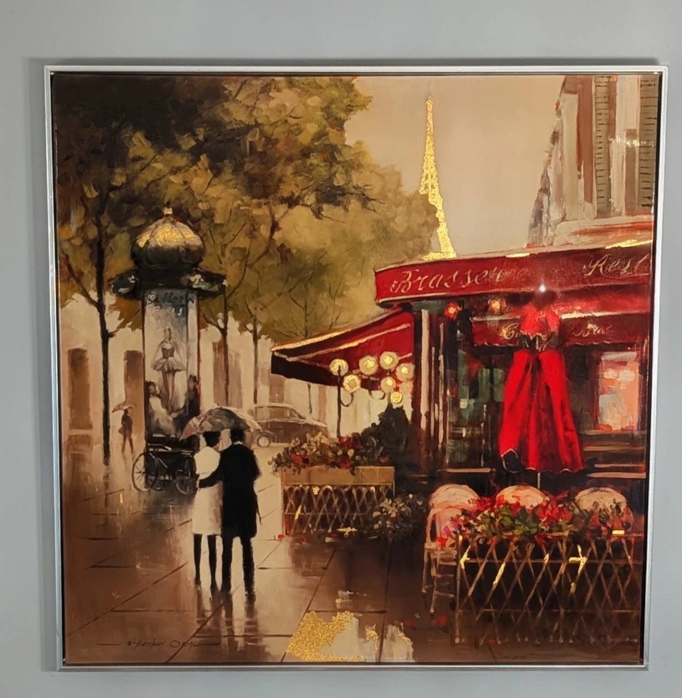This beautiful painting of a brasserie scene from Paris. It's framed and ready to hang. The painting has some gold leaf accents and a Silver frame.