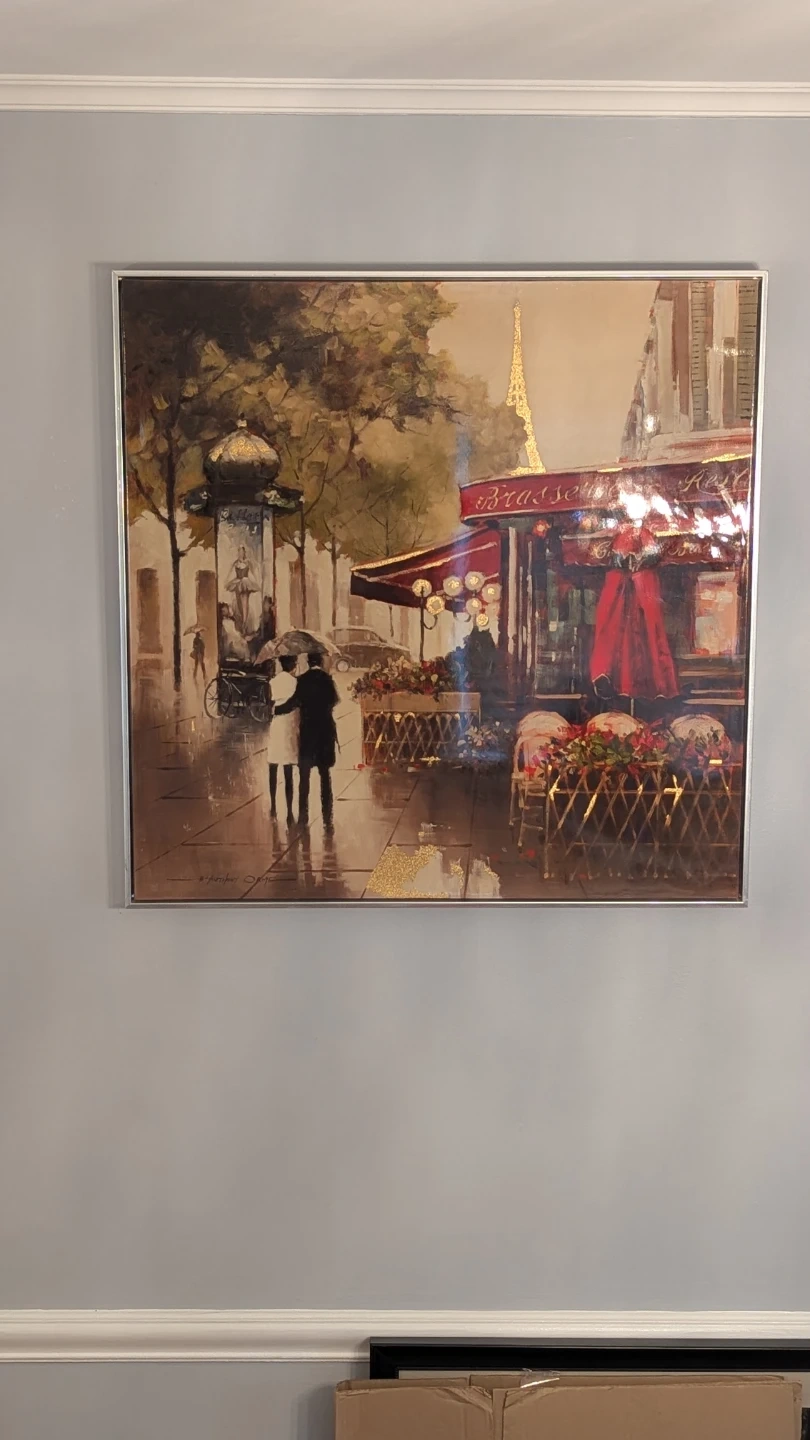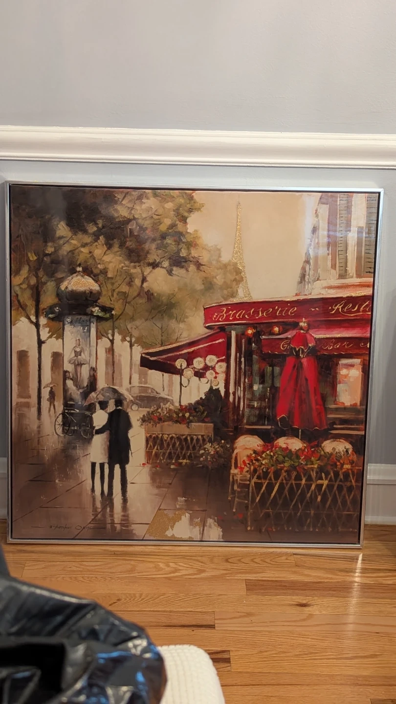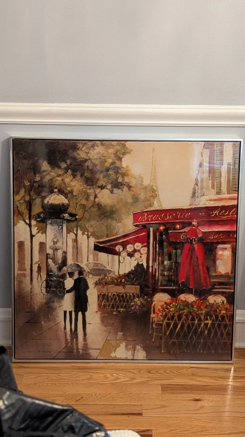 This beautiful painting of a brasserie scene from Paris. It's framed and ready to hang. The painting has some gold leaf accents and a Silver frame.