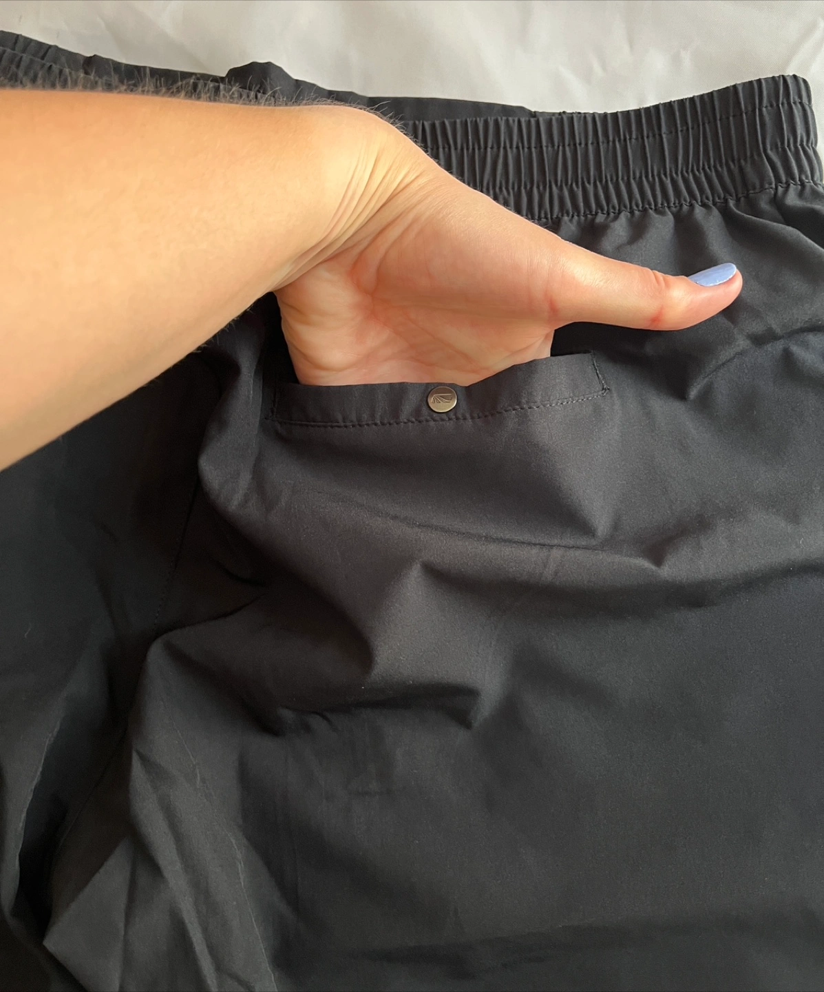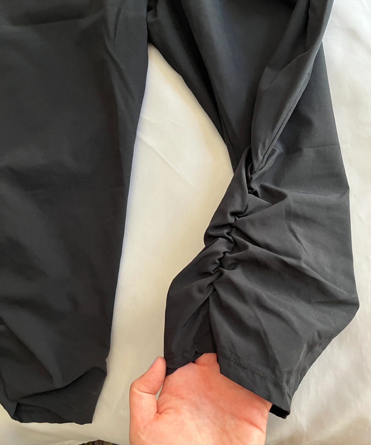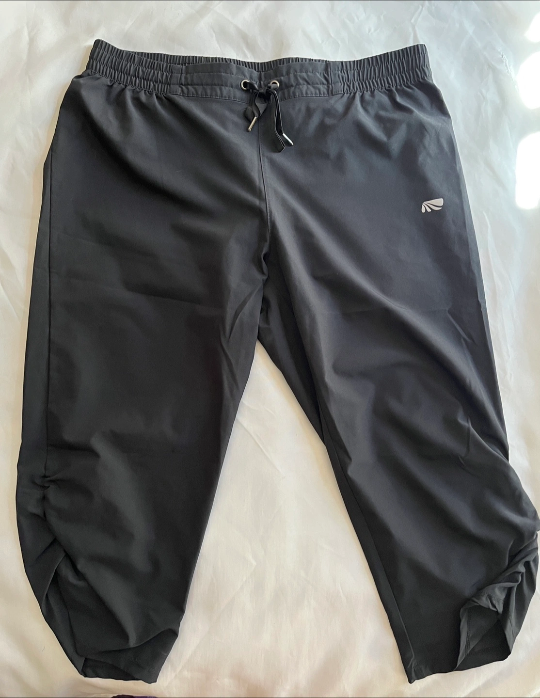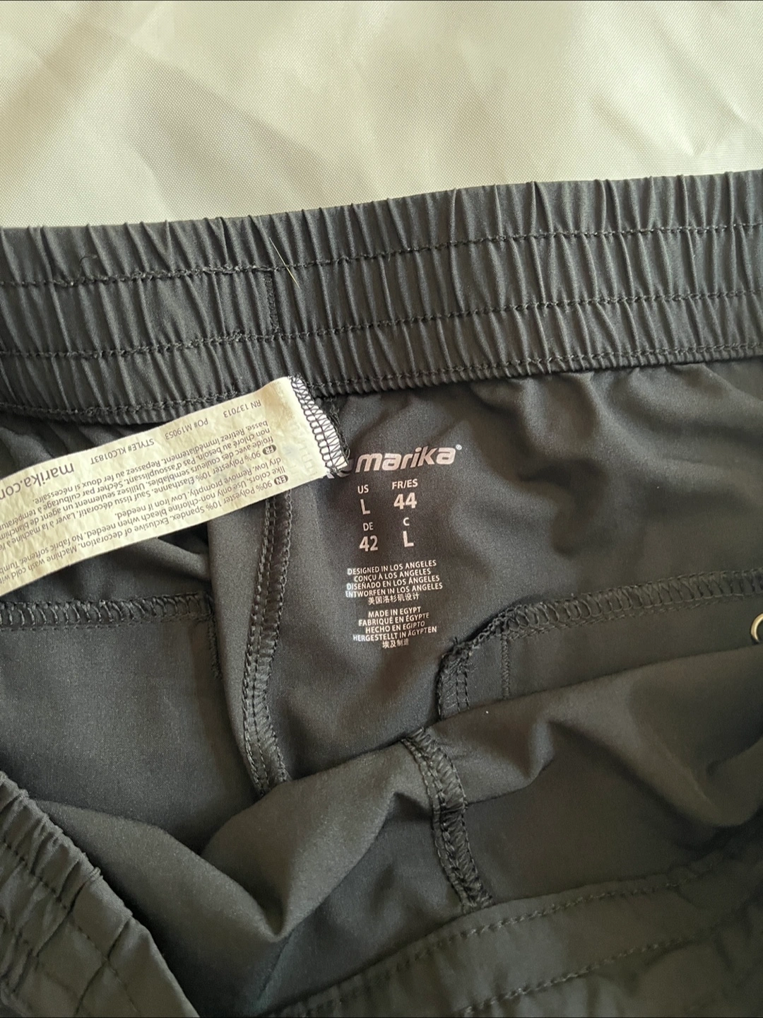 Marika sport activewear capris, hits just below knee, super lightweight material, back pockets with snaps, drawstring waist, roughing at the bottom hems.