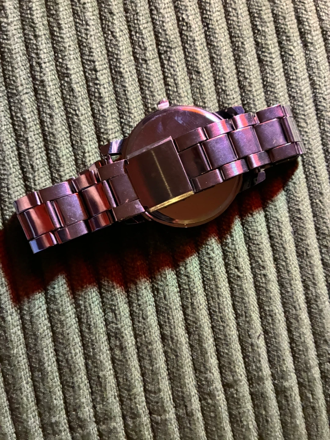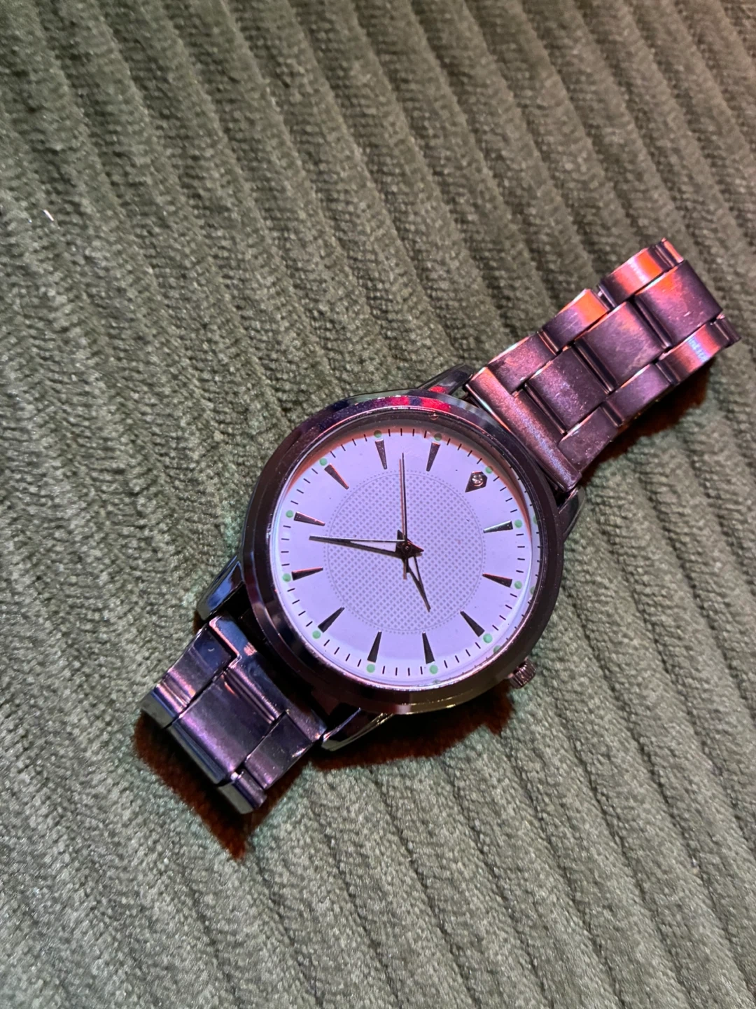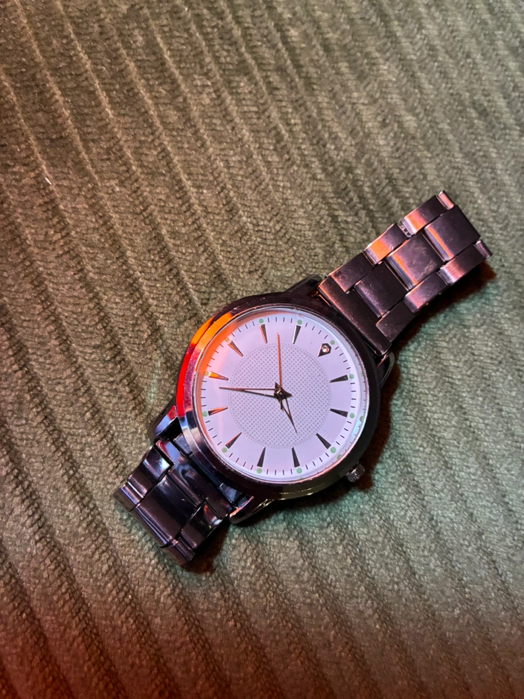 This is a men's watch with a stainless steel band and a white dial. It features a date window and silver-tone hands and markers. The watch has a classic, sleek design. It is in great working condition.