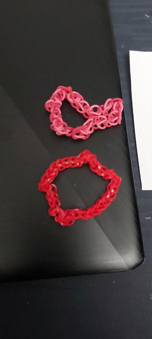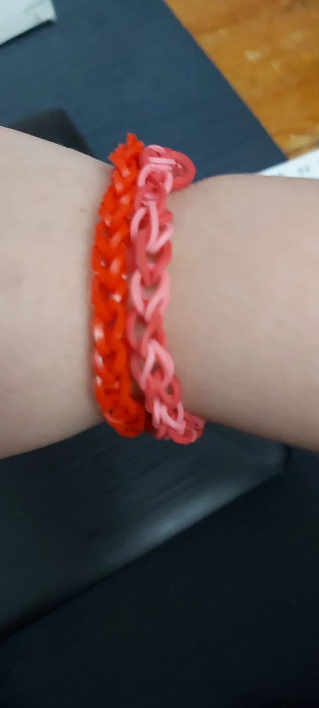 Two handmade loom band bracelets. One is bright red, and the other is a light pink color. These fun accessories are perfect for adding a pop of color to any outfit!