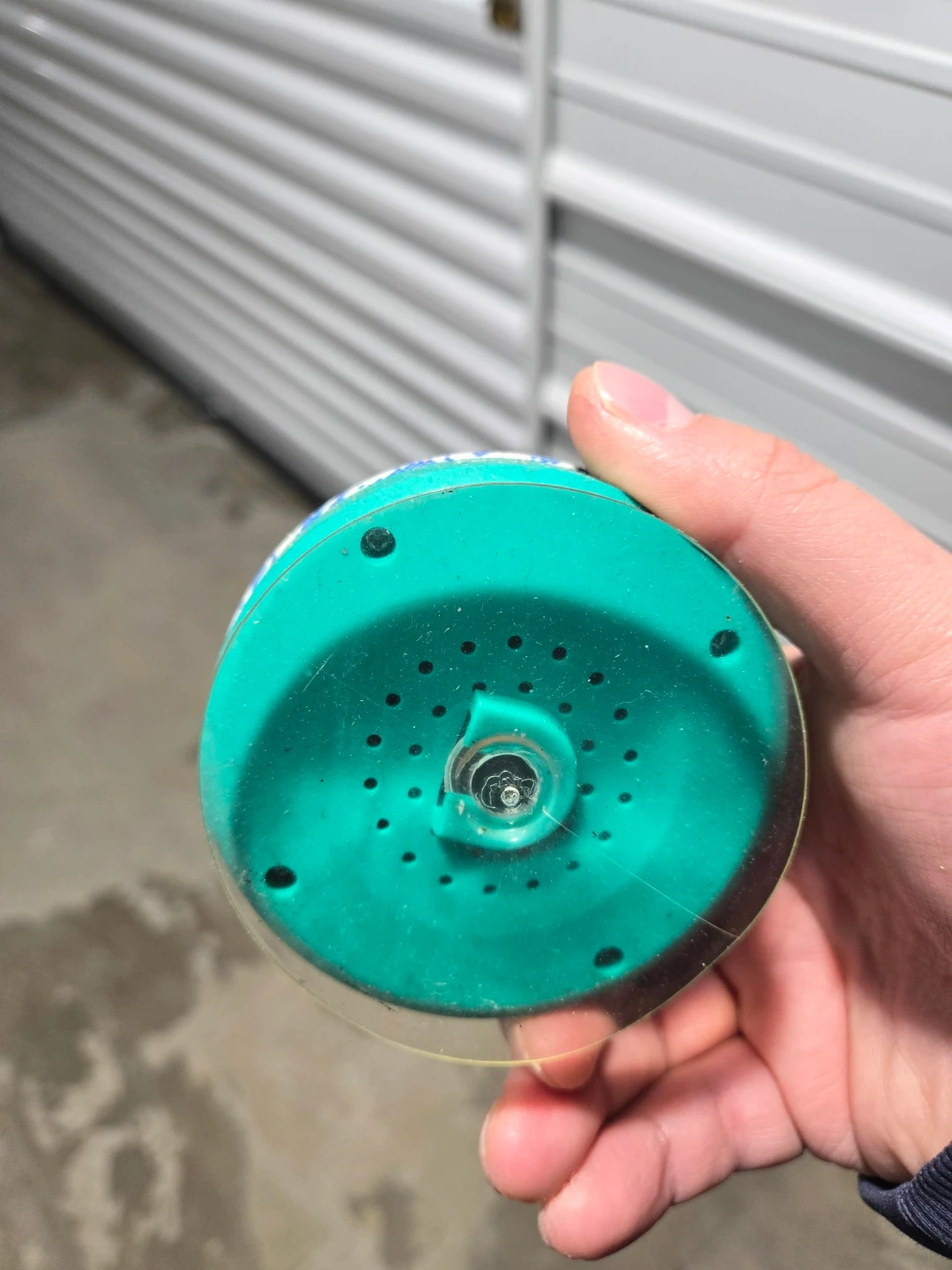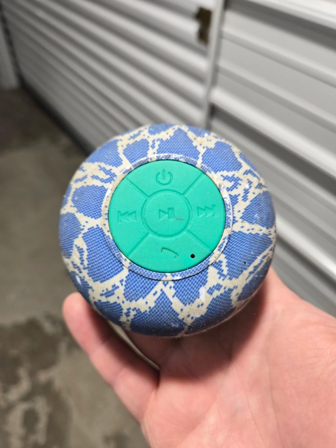 This is a portable Aqua Sound Bluetooth speaker. It features a blue and white patterned fabric exterior and a green control panel. It's great for listening to music on the go! Perfect for showers and is water resistant