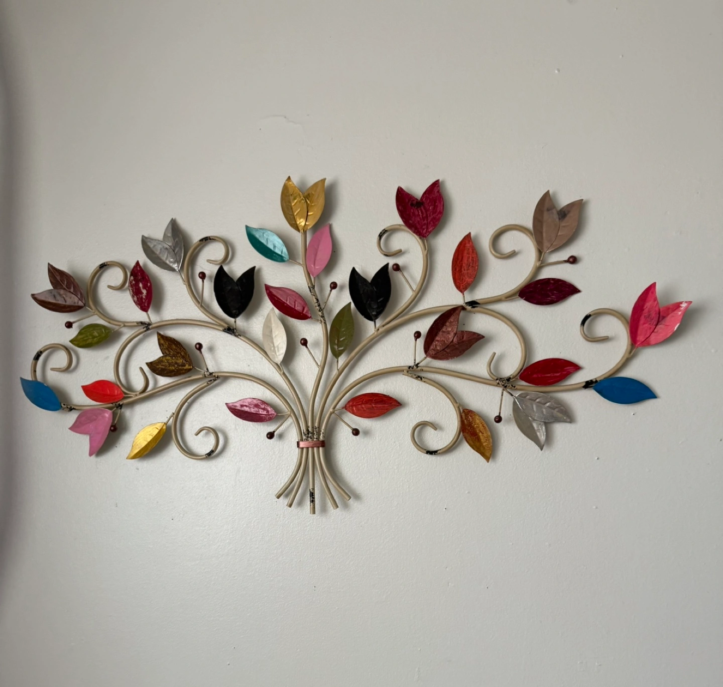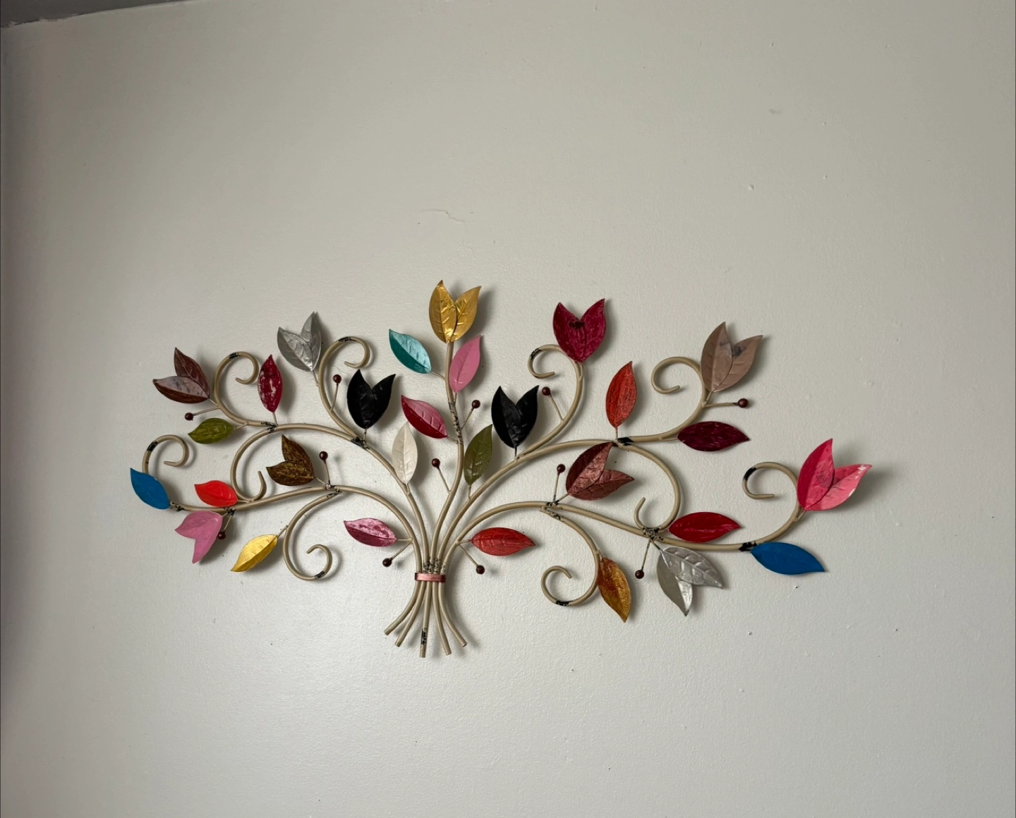Metal wall art with colorful leaves. Features an array of colors, in varying leaf shapes. A simple yet beautiful decoration, perfect for any home.