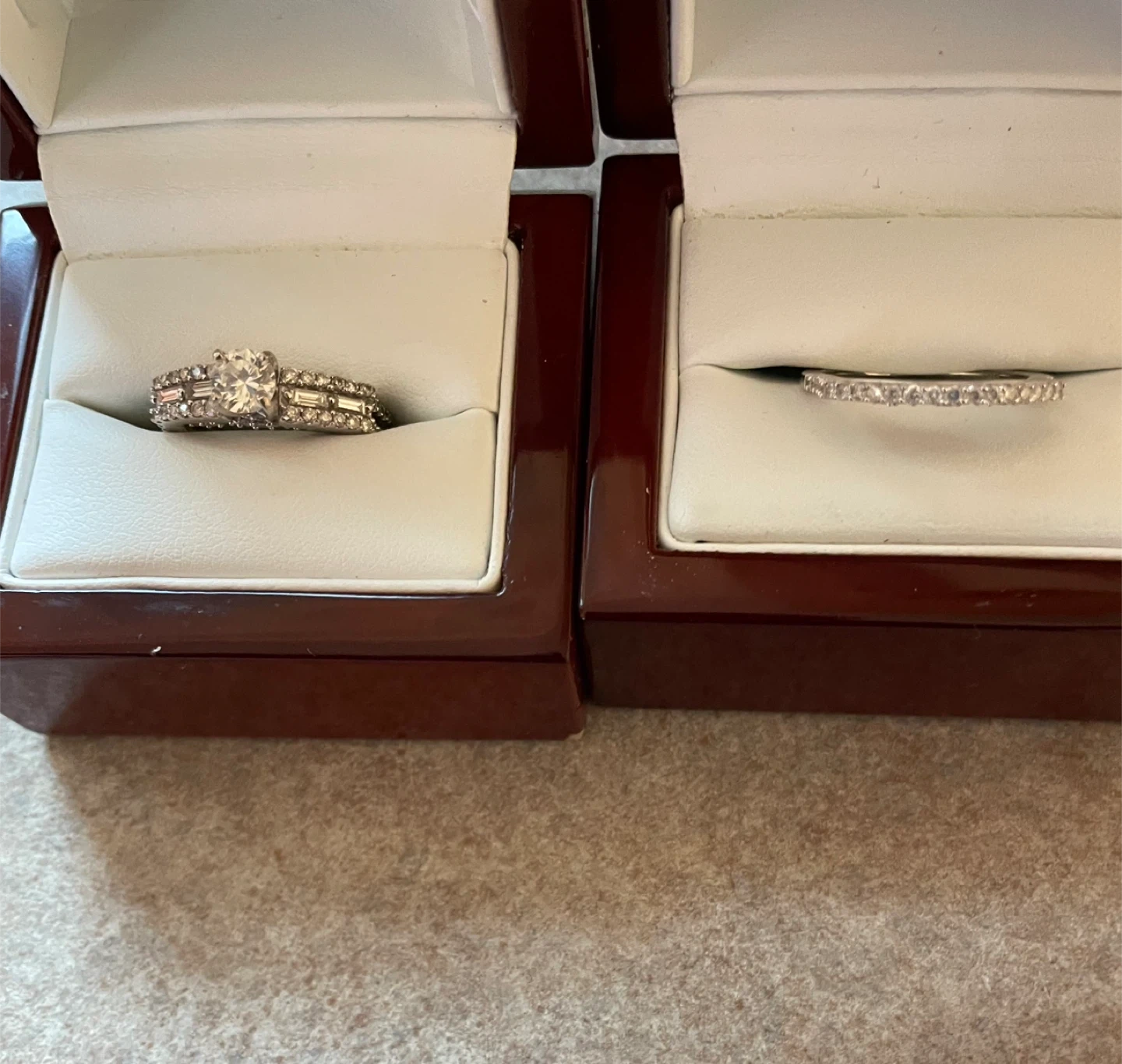 5Selling a beautiful diamond ring set. It comes in a wooden box. The set includes an engagement ring and a wedding band. Perfect for a special occasion!