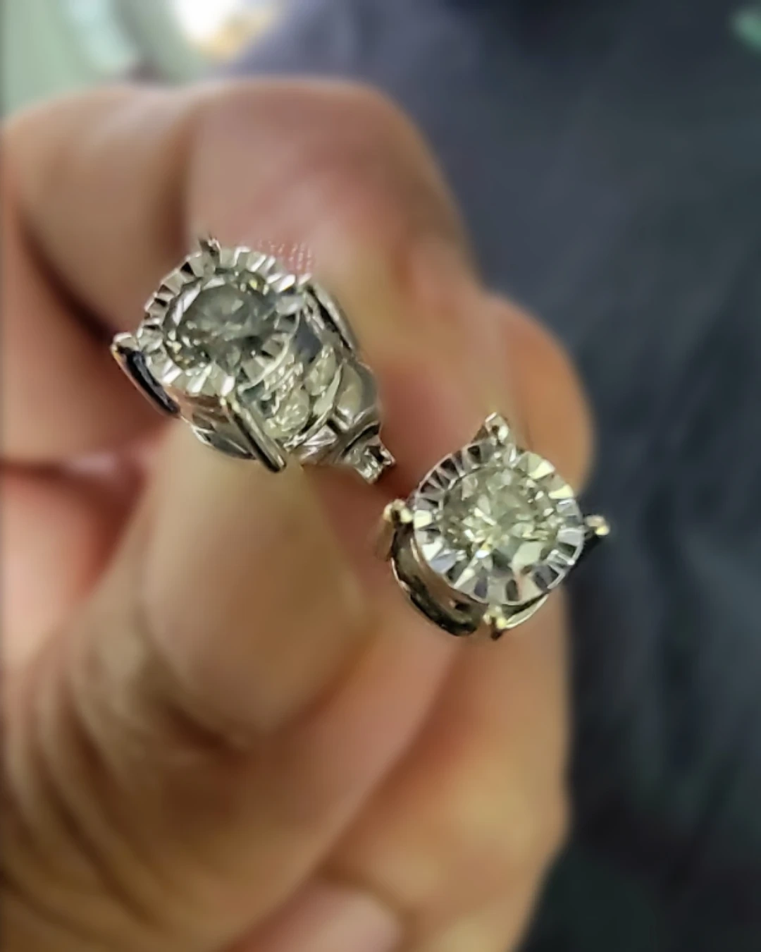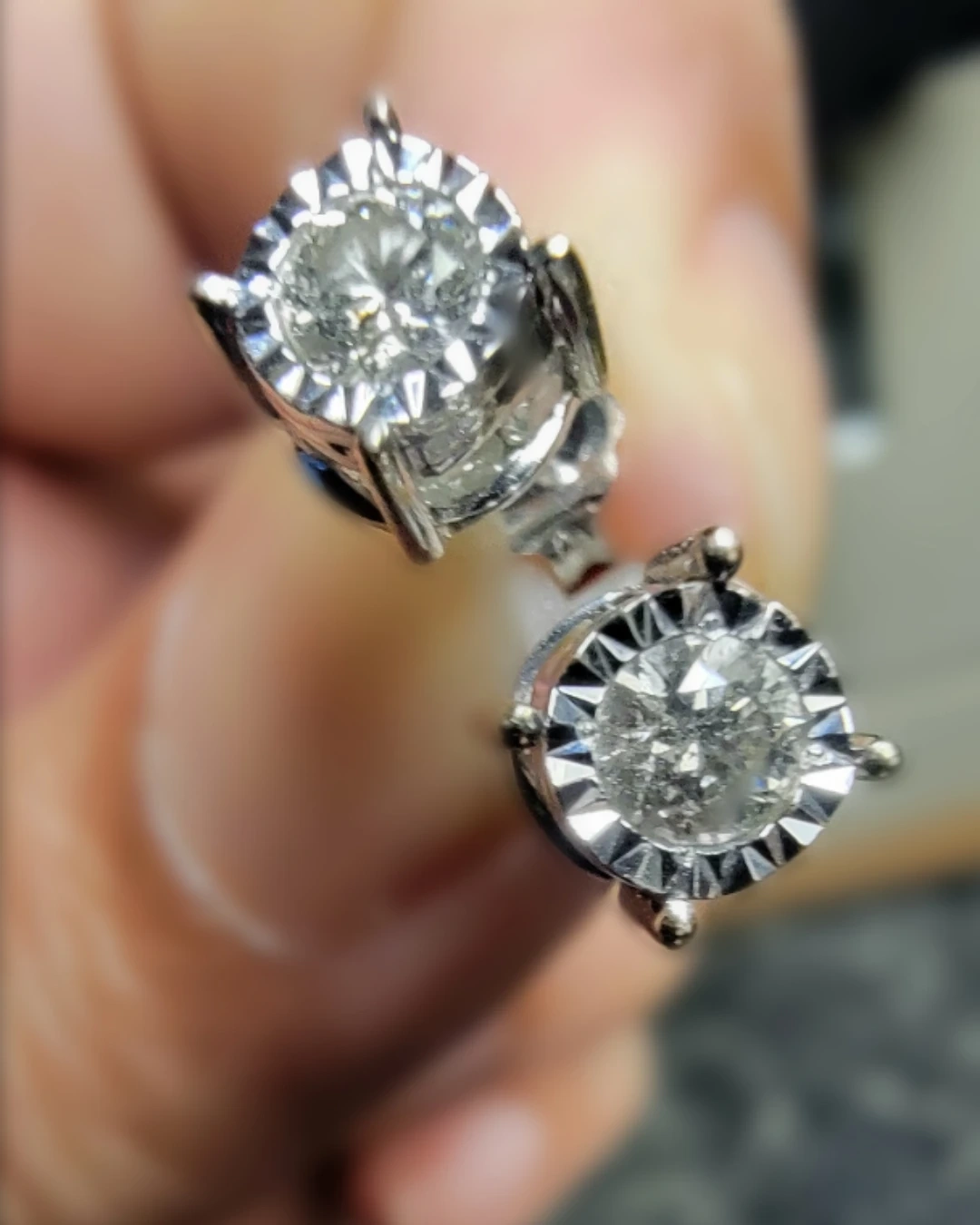 101ct diamonds on 14kt white gold. They are in great condition and sparkle beautifully! Perfect for adding a touch of elegance to any outfit