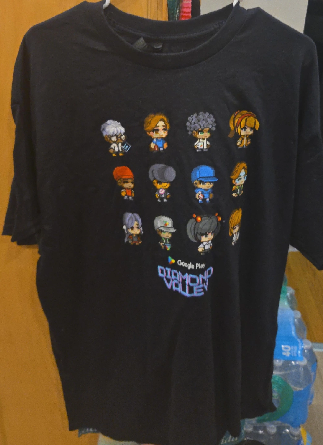 65Selling a black T-shirt featuring characters from the Google Play game Diamond Valley! The shirt has a cool, pixelated design and is perfect for fans of the game or anyone who likes unique graphic tees
