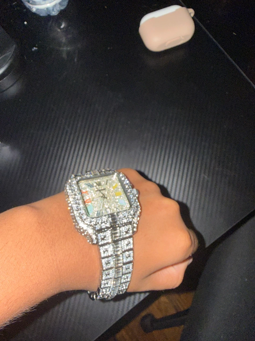Moisinate watch Cartier Selling a diamond watch. It has a silver band and a square face with a diamond bezel. It is in good condition.