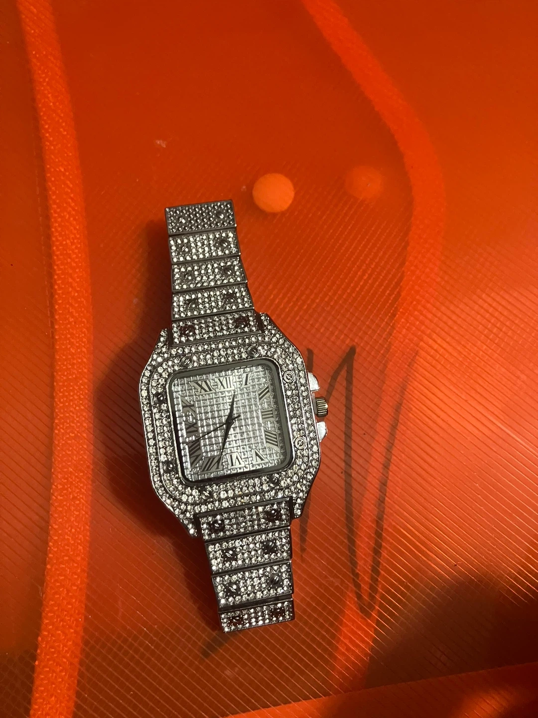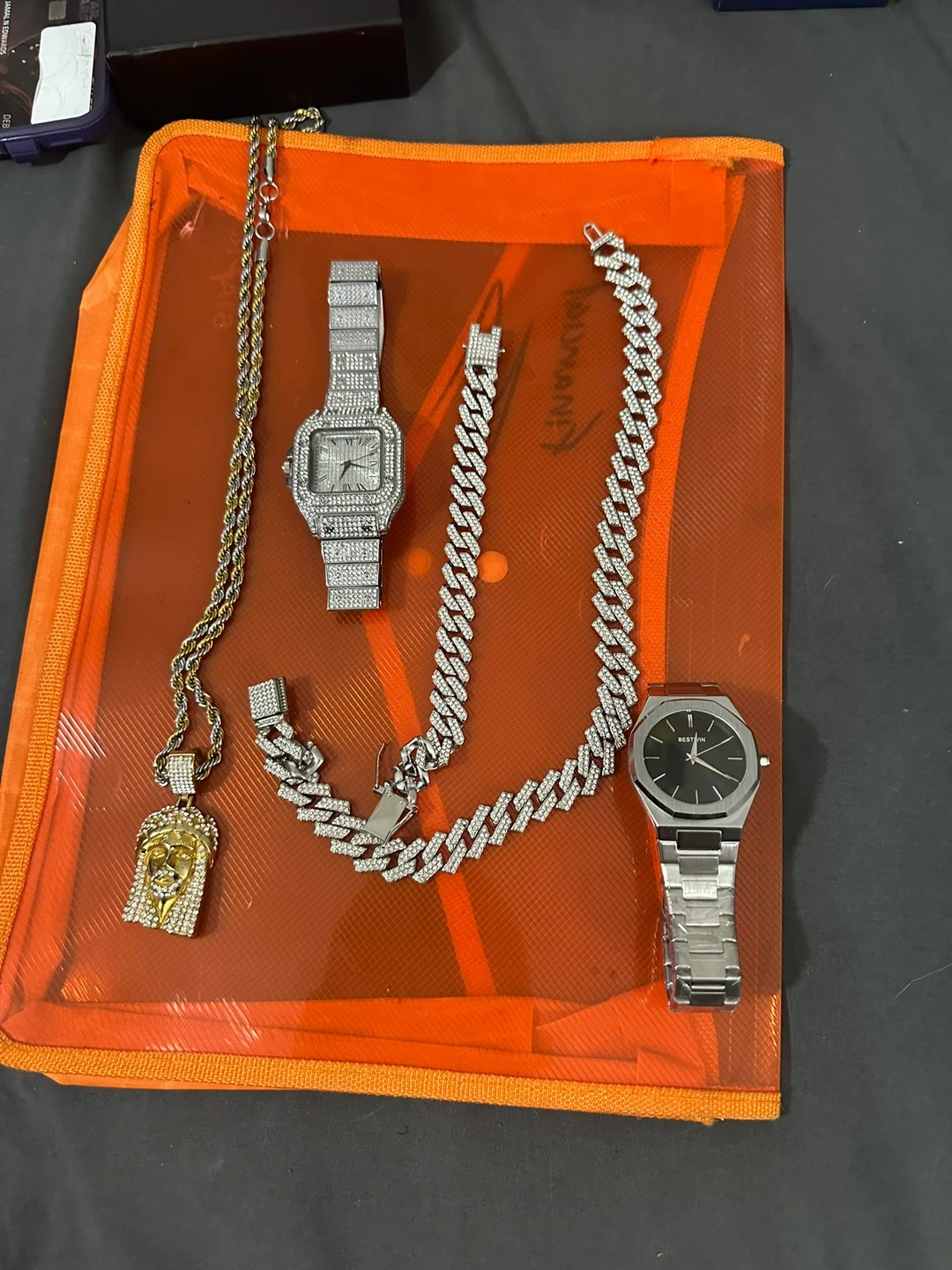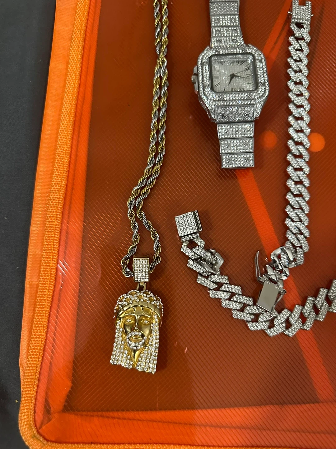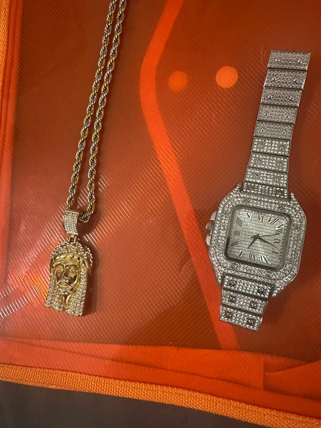 60Selling a set that includes a diamond watch, a Jesus pendant with a gold chain, and a diamond bracelet! They are in great condition and ready to add some shine to your style