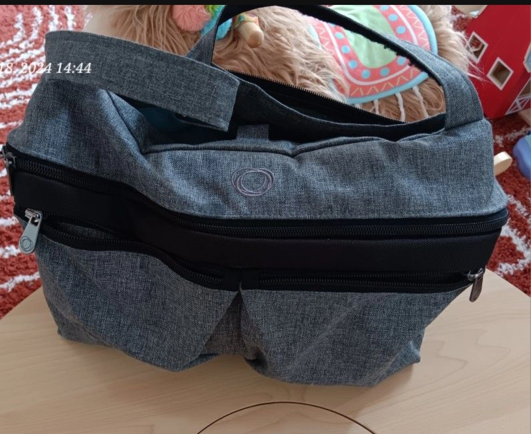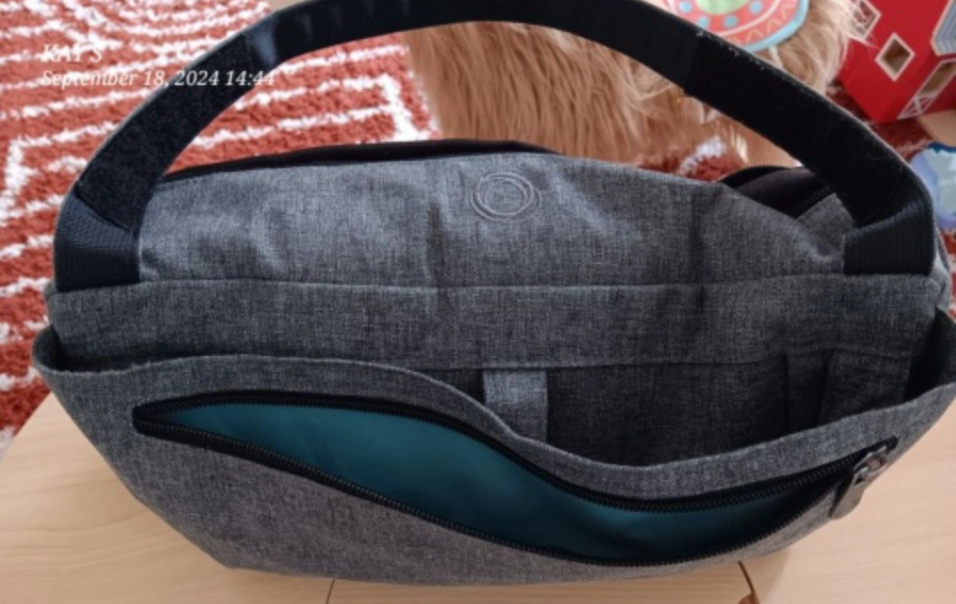 with a zippered front pocket and multiple interior pockets. The bag has a single shoulder strap.