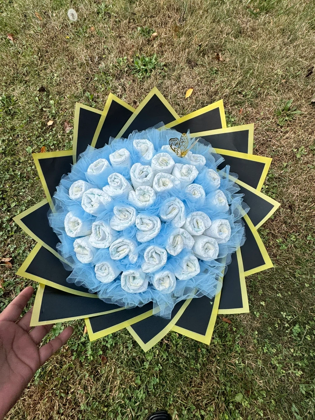 This is a beautiful diaper bouquet, perfect as a centerpiece or gift for a baby shower! It's made with rolled diapers and decorated with blue tulle and a butterfly accent. A unique and practical way to celebrate a new baby
