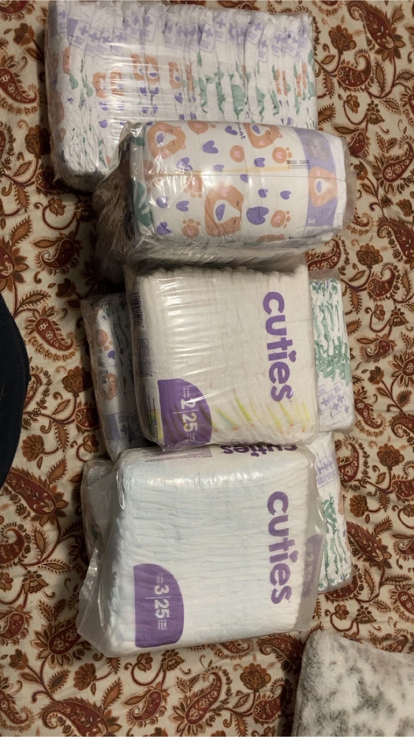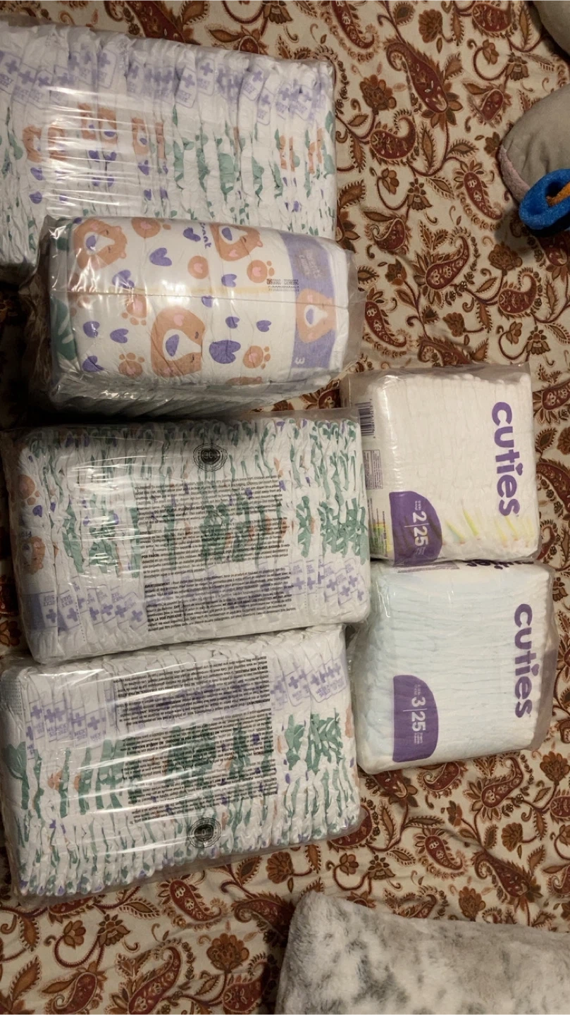 I have some Cuties diapers for sale! They are still sealed in their original packaging. I have 4 (42 count) parents choice sealed size 3 diapers. 1 (25 count) cuties size 2 & 1 (25 count) cuties size 3