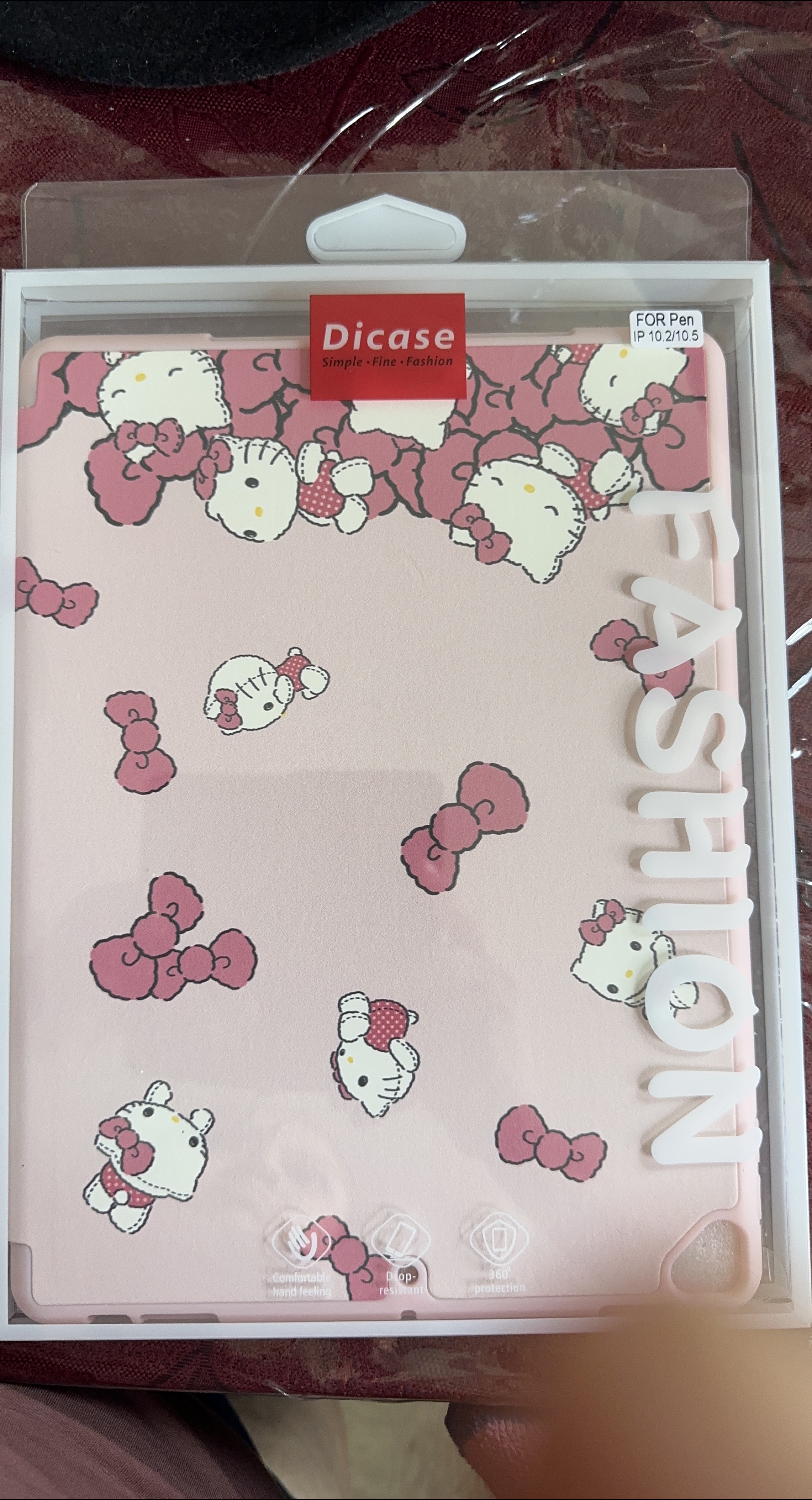 293Selling a brand new Dicase iPad case with a cute Hello Kitty design! It's designed for the iPad 10.2 and 10.5 models. The case is pink and features a 'Fashion' design on the side. It also offers 360-degree protection and is drop-resistant, with a comfortable hand feeling. Comes in its original packaging