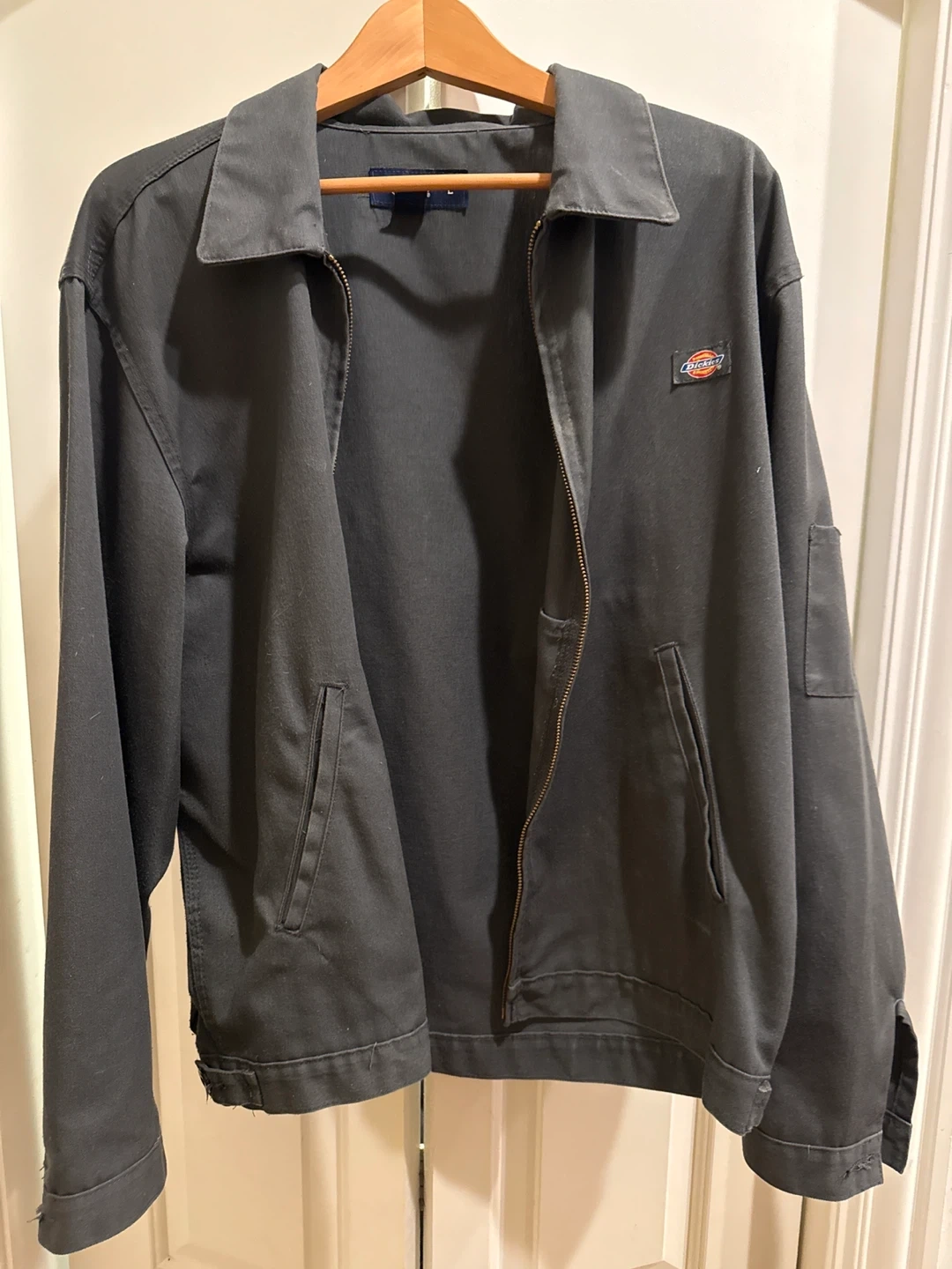 Selling a Dickies Eisenhower jacket in size L. It's a classic and durable jacket that's perfect for everyday wear. This jacket features a zip-up front, and it has a clean, versatile look. Great for layering or wearing on its own!