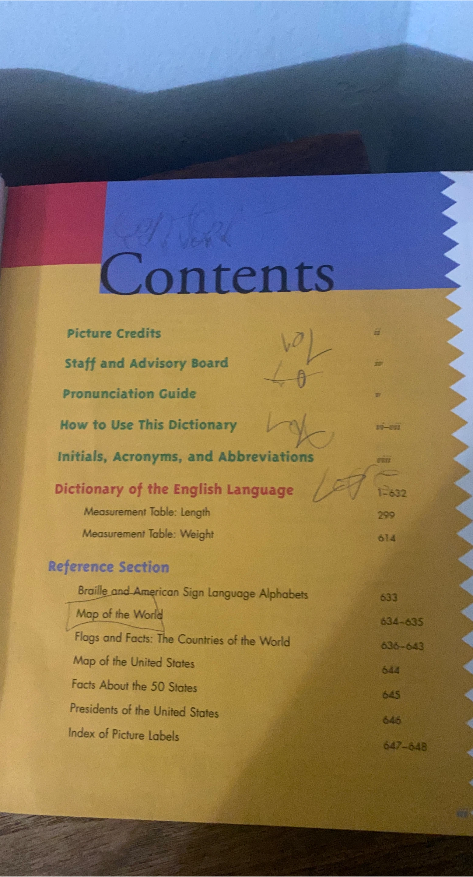 Dictionary of the English Language. Includes a reference section, braille and American sign language alphabets, map of the world, flags and facts: the countries of the world, map of the United States, facts about the 50 states, presidents of the United States, and index of picture labels