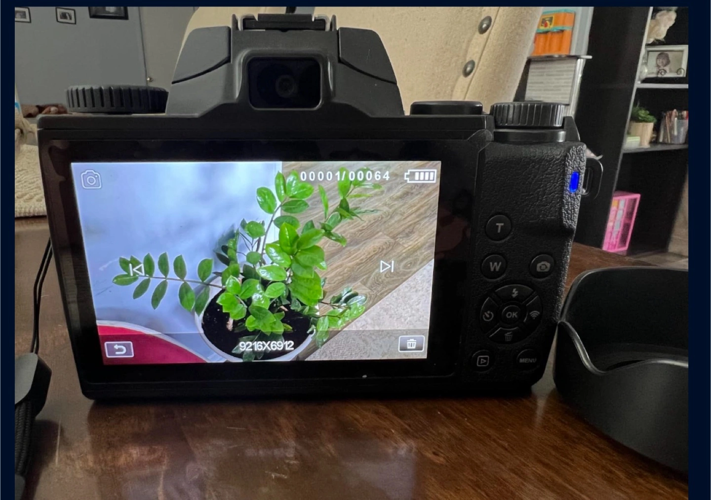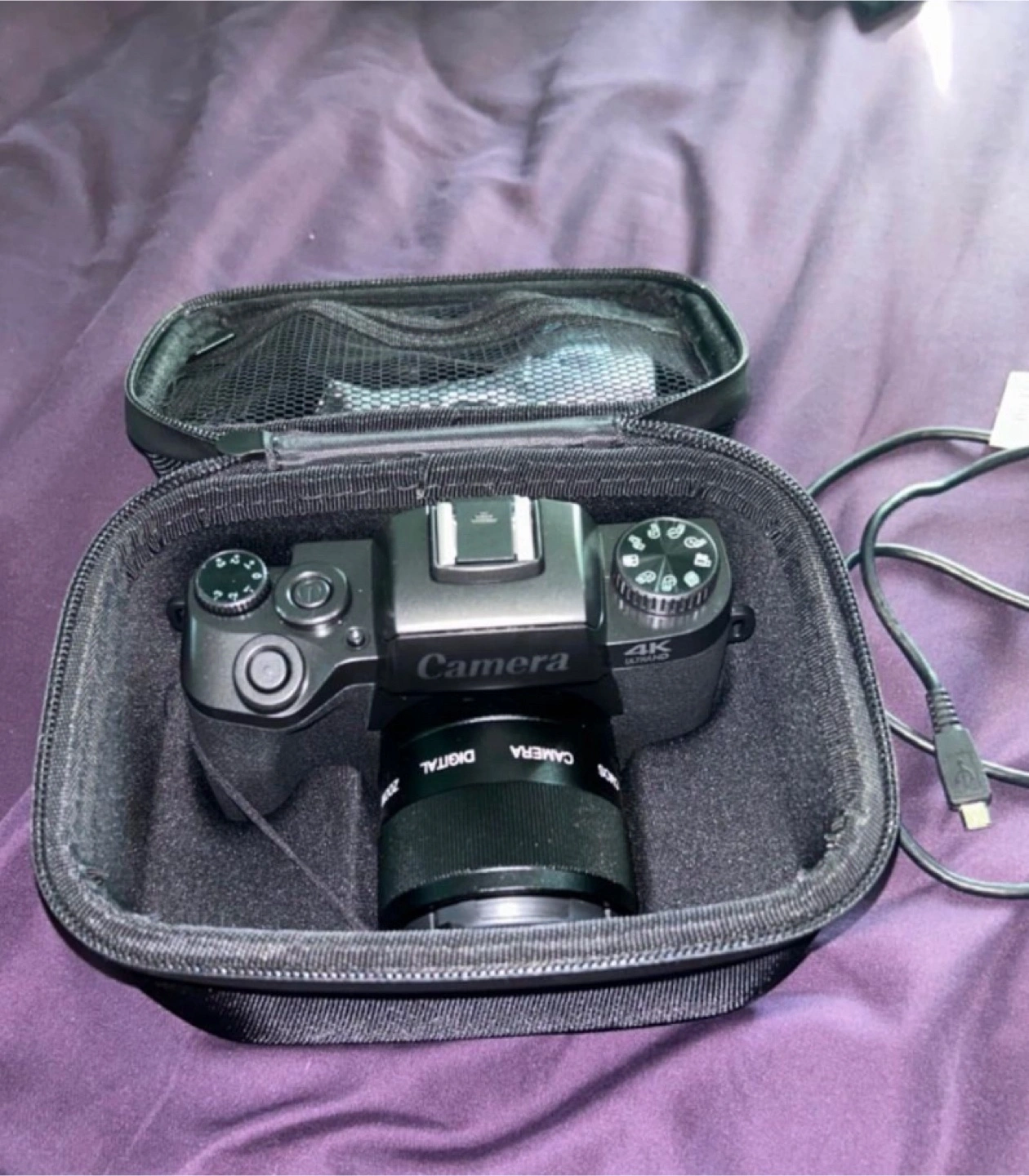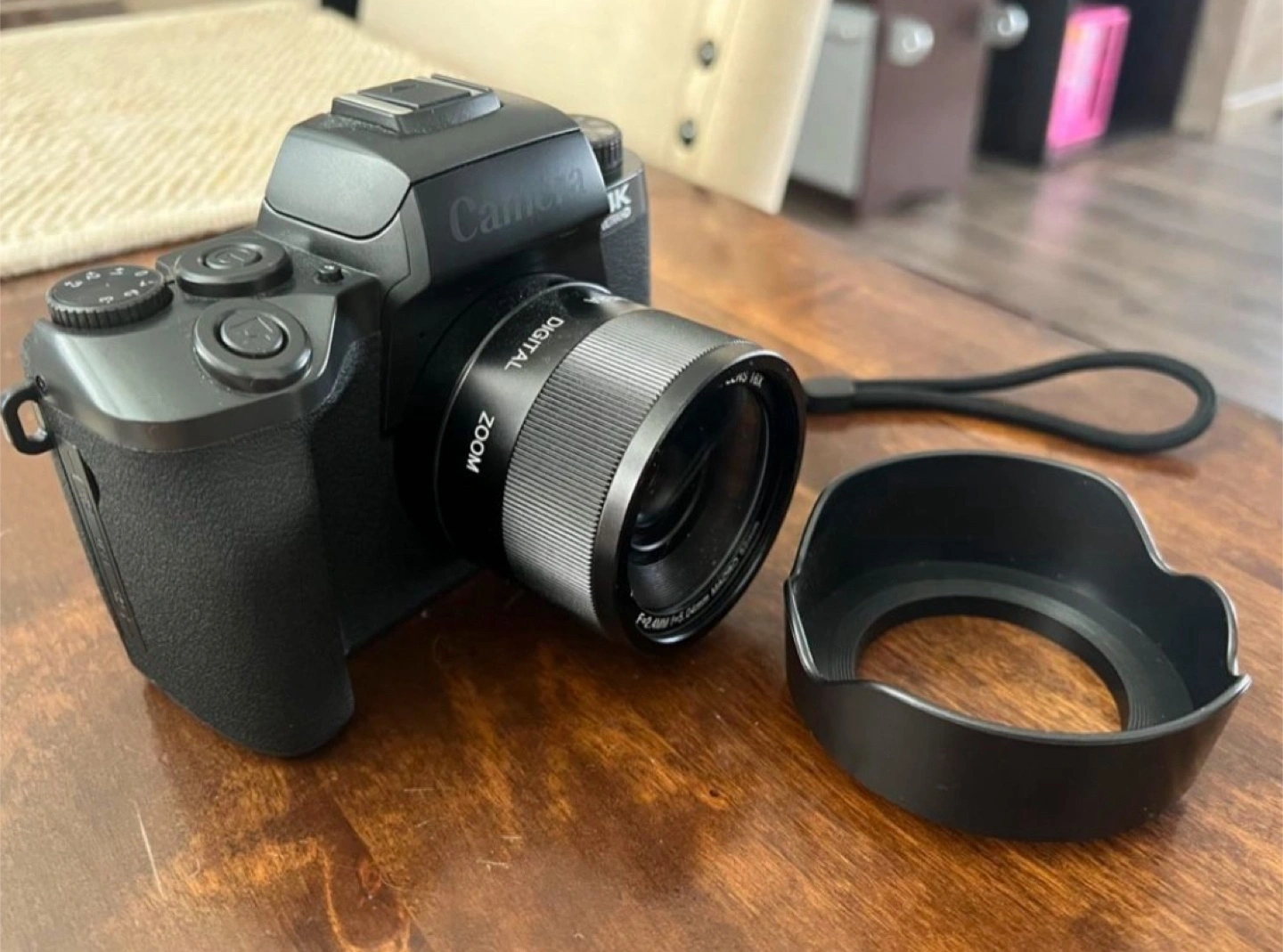 I'm selling a digital camera that shoots in 4K. It comes with a lens hood and a carrying case. Perfect for photography enthusiasts!