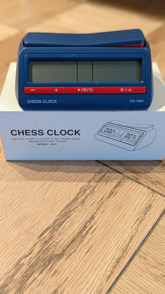 117A digital chess clock, in blue and red. It has multiple buttons and a display screen. The box is also included, with extra details about the item. Playing chess with this clock would bring a moment of calm to your day.