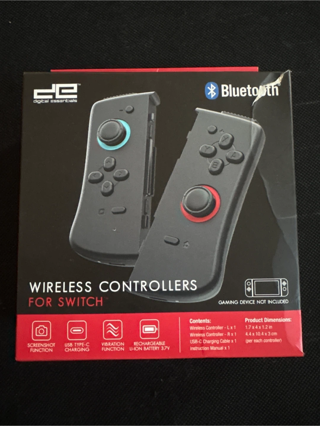 Selling a set of Digital Essentials wireless controllers for the Nintendo Switch! They are in good condition and come in the original box. Includes: - Wireless Controller - L x 1 - Wireless Controller - R x 1 - Instruction Manual x 1 Product Dimensions: 1.7 x 4 x 1.2 in (4.4 x 10.4 x 3 cm) per controller Local pick up Only !!!
