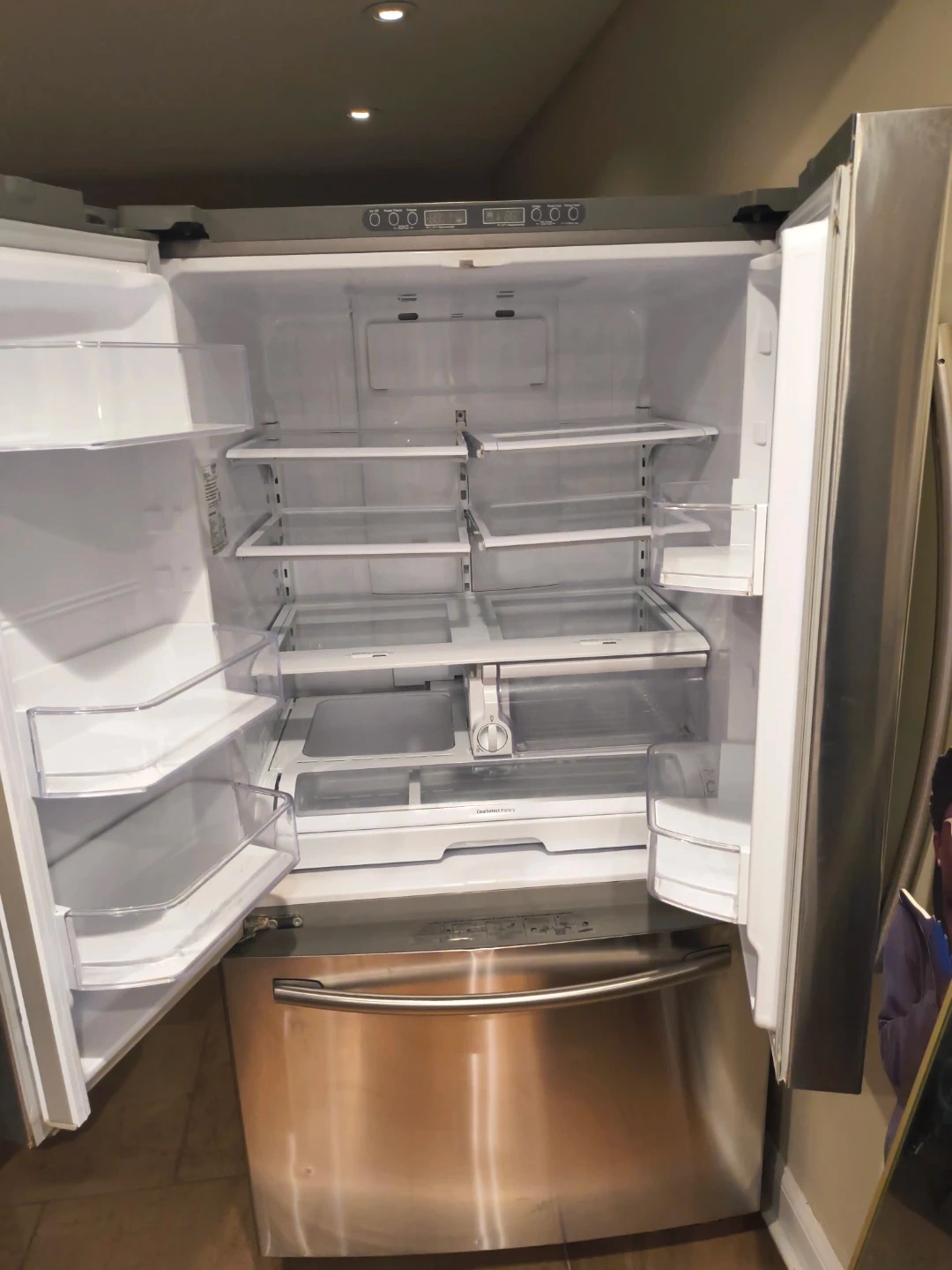 Stainless steel French door refrigerator. It's a 3-door model with a bottom freezer drawer. Features CoolSelect Pantry for optimal food storage. Great for keeping groceries fresh! And also makes ice