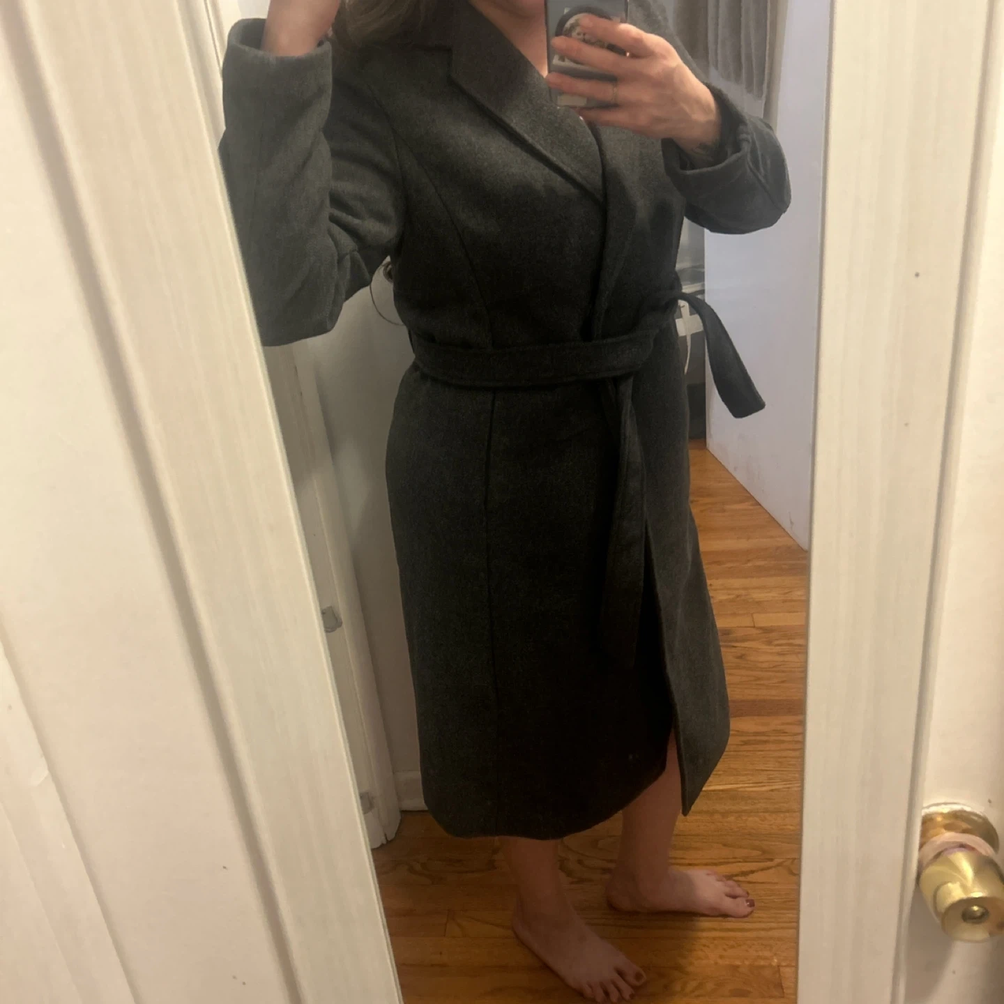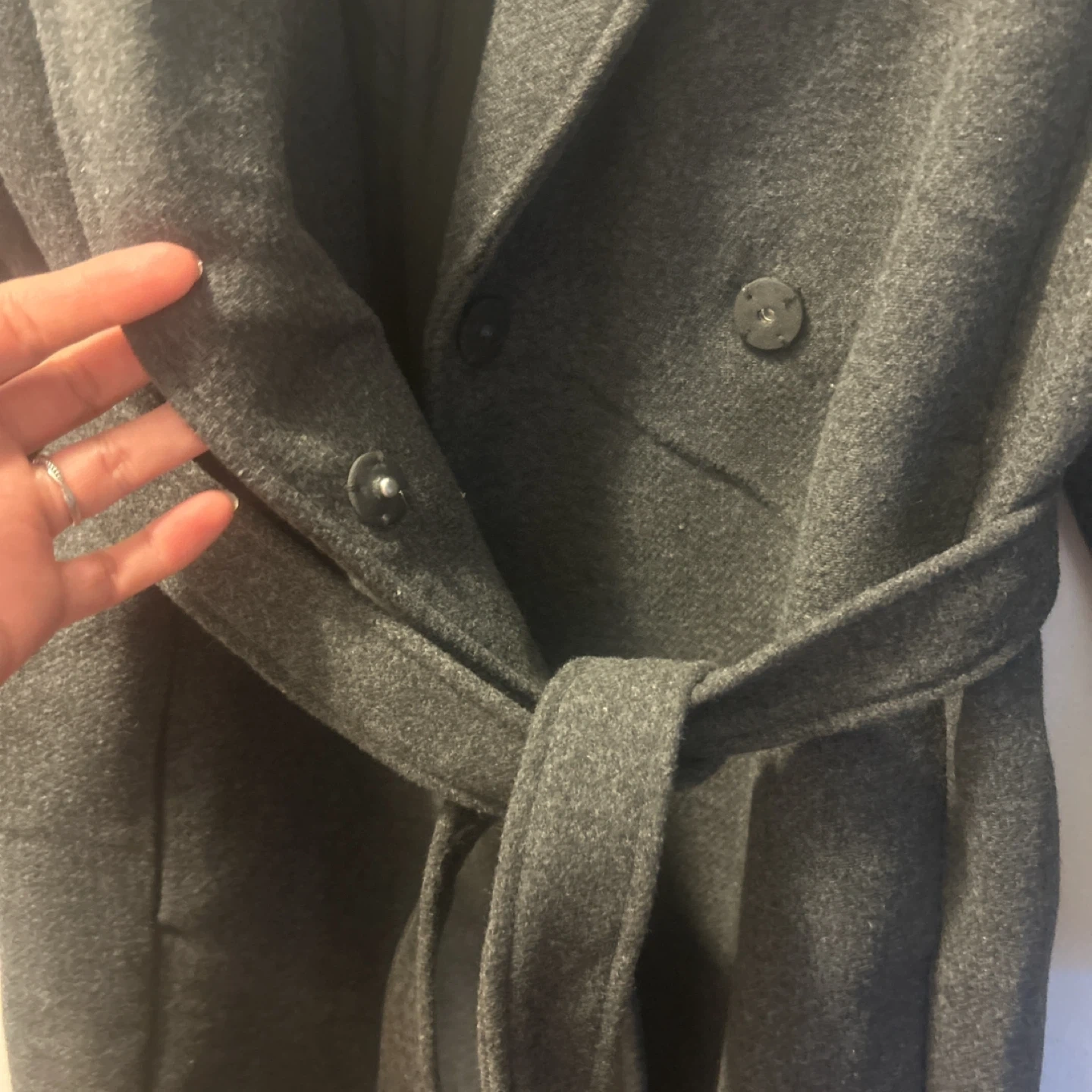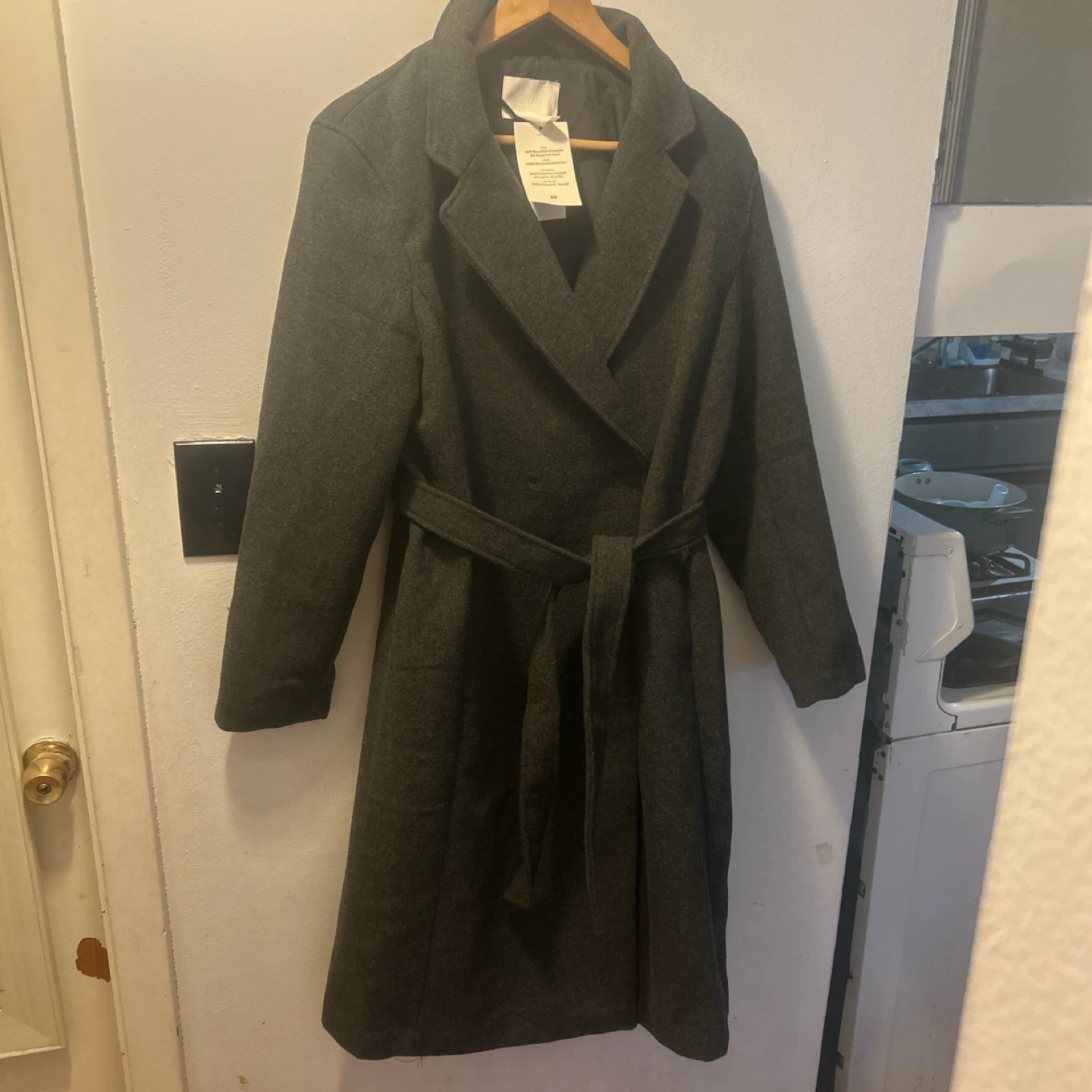 Selling a stylish H&M tie-belt coat in dark gray! It's a beautiful coat that originally retailed for $69.99. This coat is perfect for adding a touch of elegance to any outfit. It features a tie-belt to cinch the waist and give a flattering silhouette