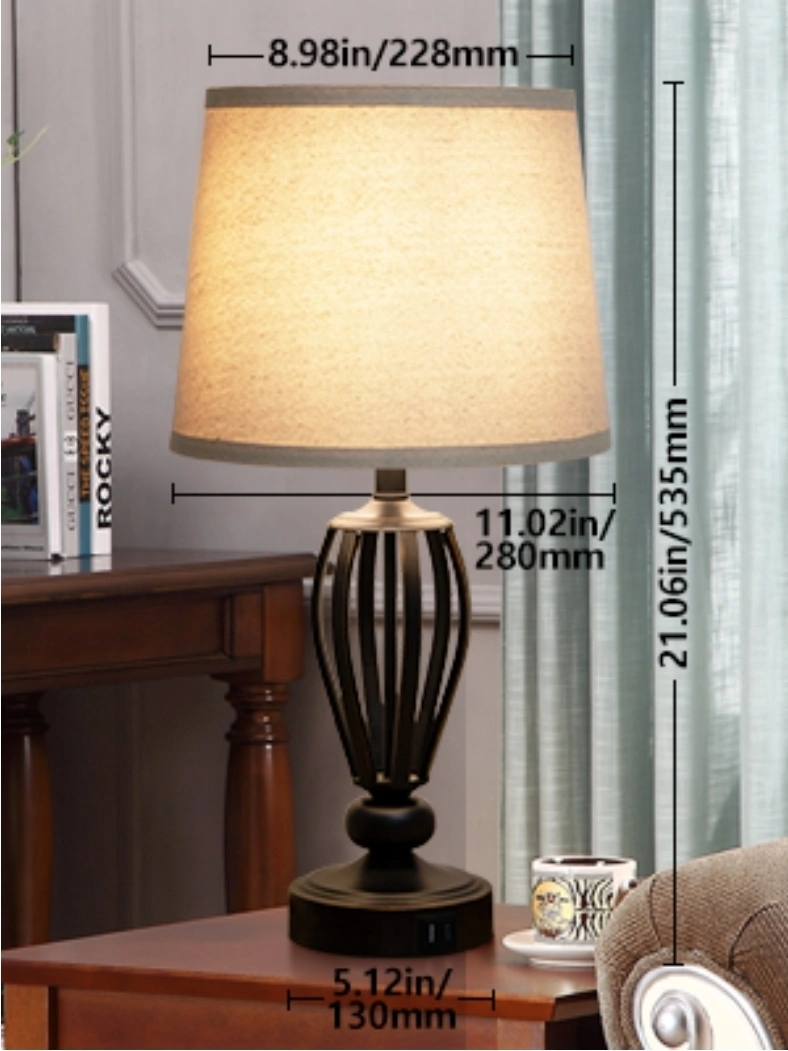 This dimmable table lamp features 3-way touch control, so you can easily adjust the brightness. It also has USB C+A charging ports, making it convenient to charge your devices right on the table. The lamp measures approximately 21 inches tall with a lampshade about 9 inches wide.
