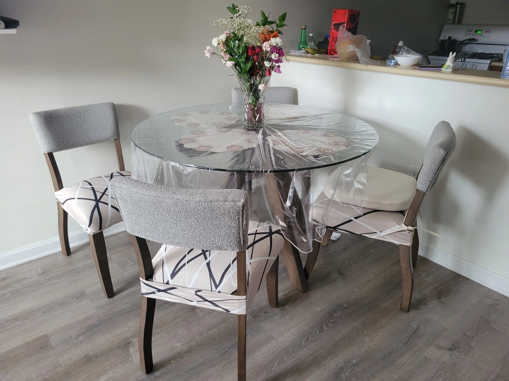 Selling a set of four dining chair covers! They're in new condition and ready to give your chairs a fresh new look. These covers are easy to slip on and off, making them super convenient for everyday use or special occasions