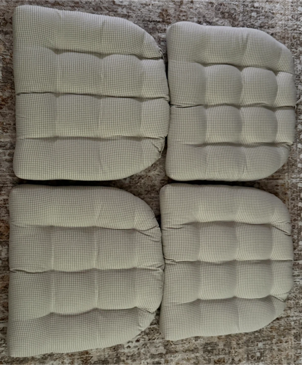 Selling a set of four Barnett Home Decor Madrid dining chair pads! These are in a neutral gingham pattern and made of 100% cotton. They're the medium size with a latex foam fill. They also have ties to keep them securely in place. Extremely comfortable and durable. Machine washable and made in the USA. Selling the set of 4 for $40. These were purchased for $40 each.