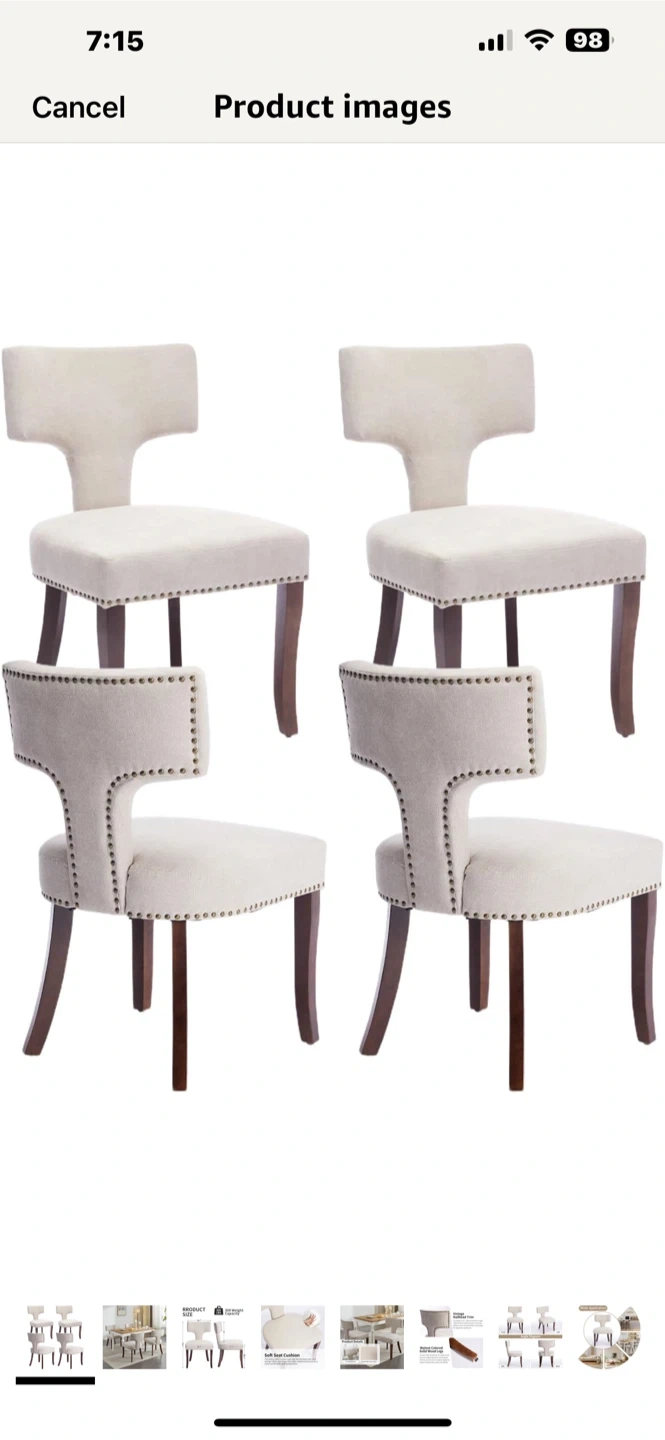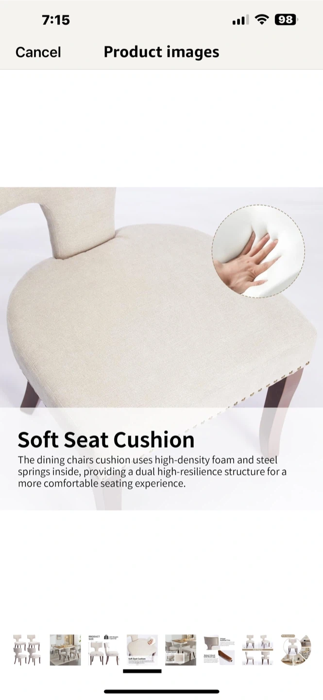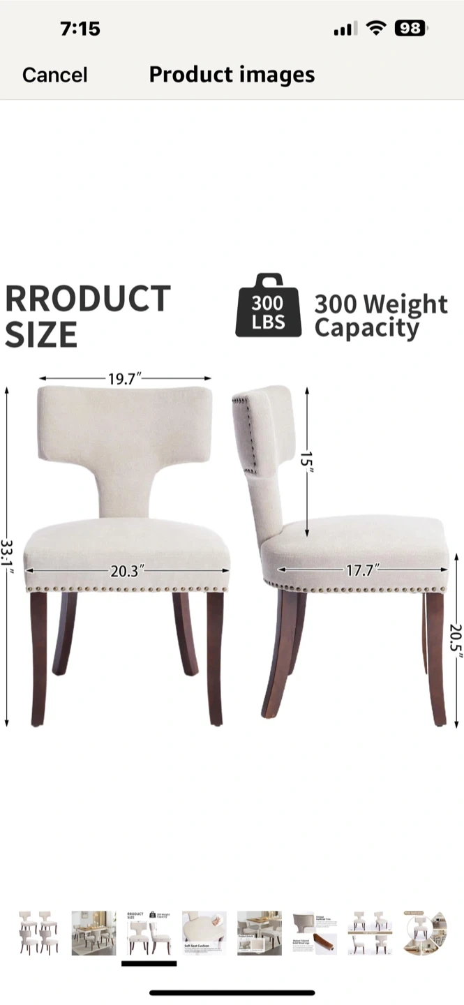 These dining chairs feature a soft seat cushion with high-density foam and steel springs for a comfortable seating experience. They also have vintage nailhead trim around the backrest and seat, adding a touch of sophistication. The legs are made of solid wood with a walnut color, providing robustness and durability. Dimensions: 19.7" x 20.3" x 33.3"