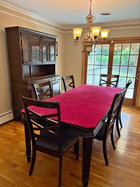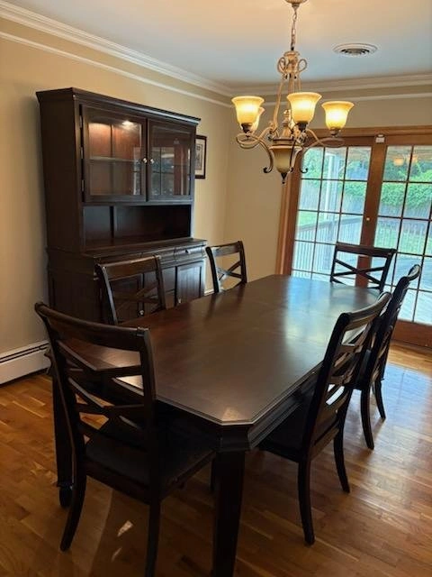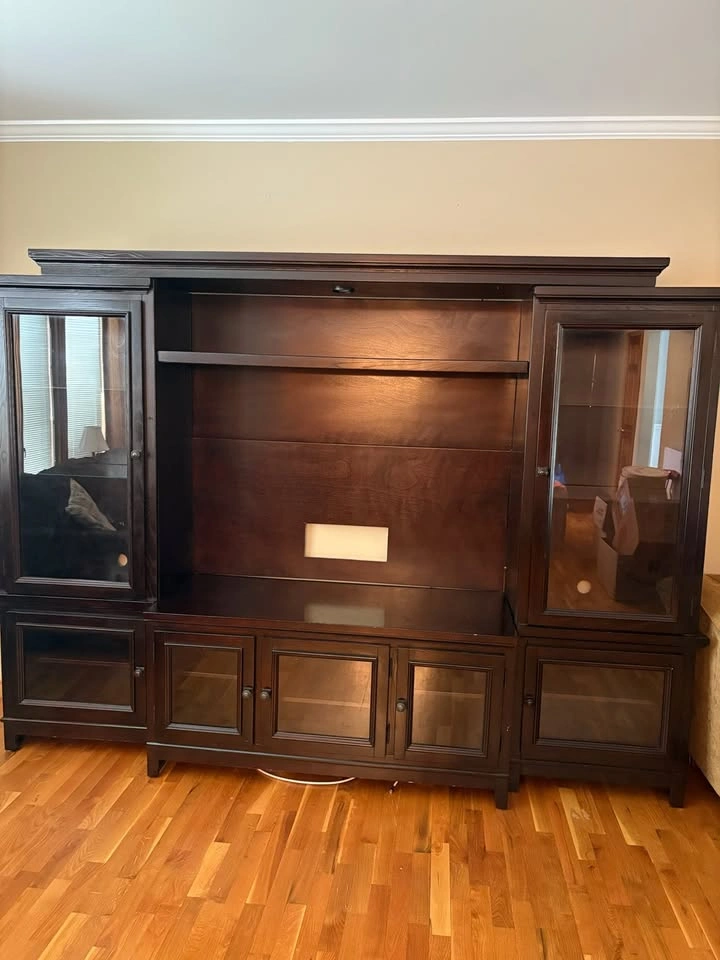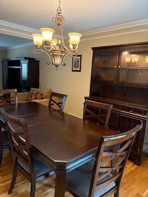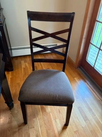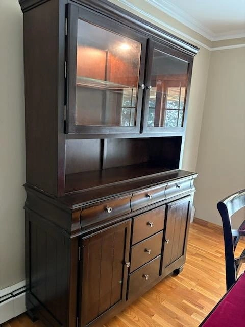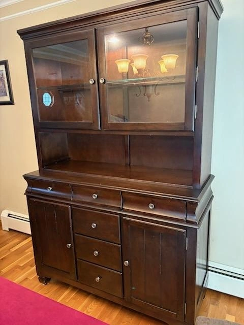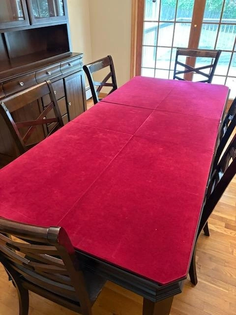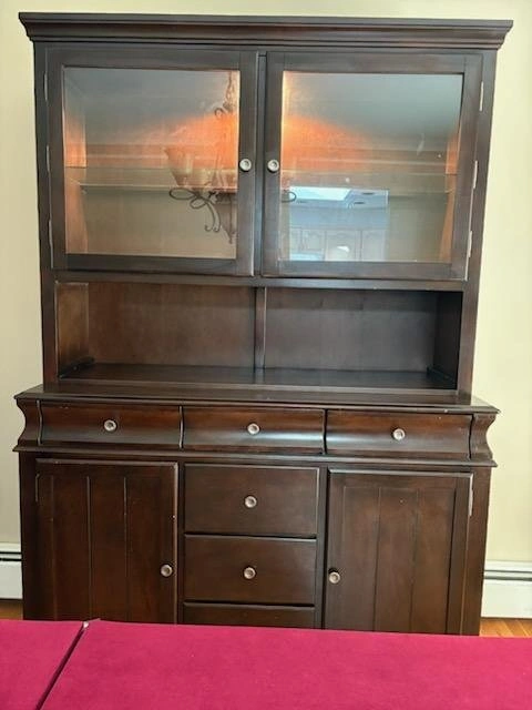 10Dining Room Table, 6 chairs, Hutch with interior lights, shelves and drawers for storage.. Table with custom made red felt interlocking pad. Color is Expresso. Great buy at $1500 for all...Ashley Furniture, solid wood.
