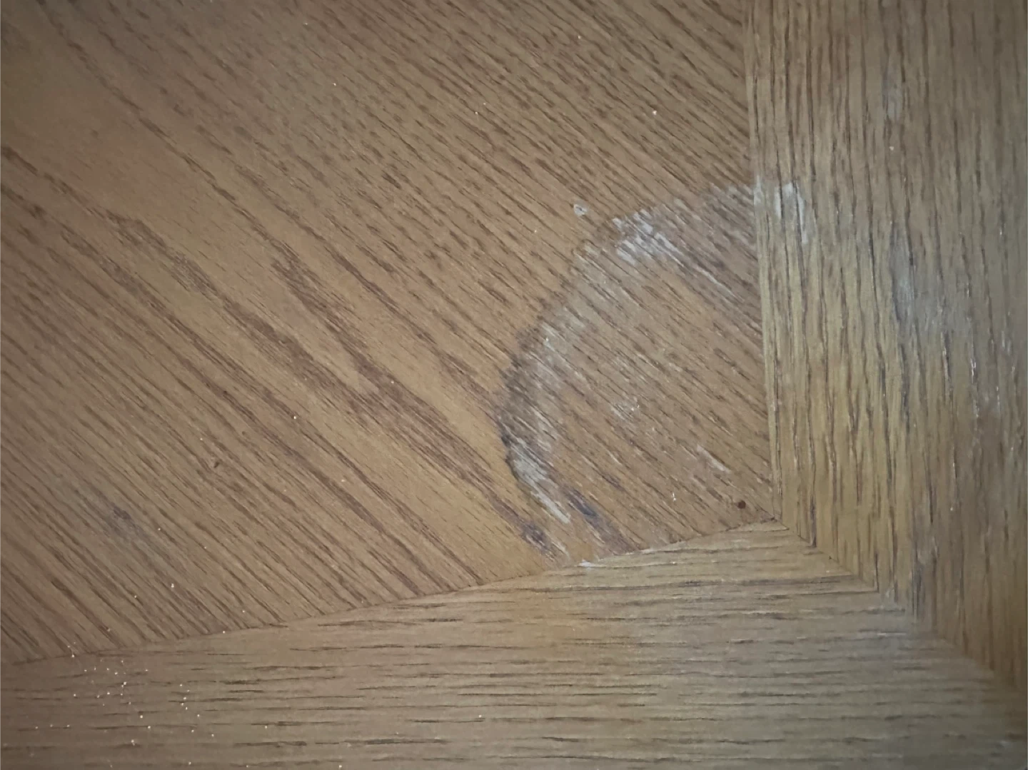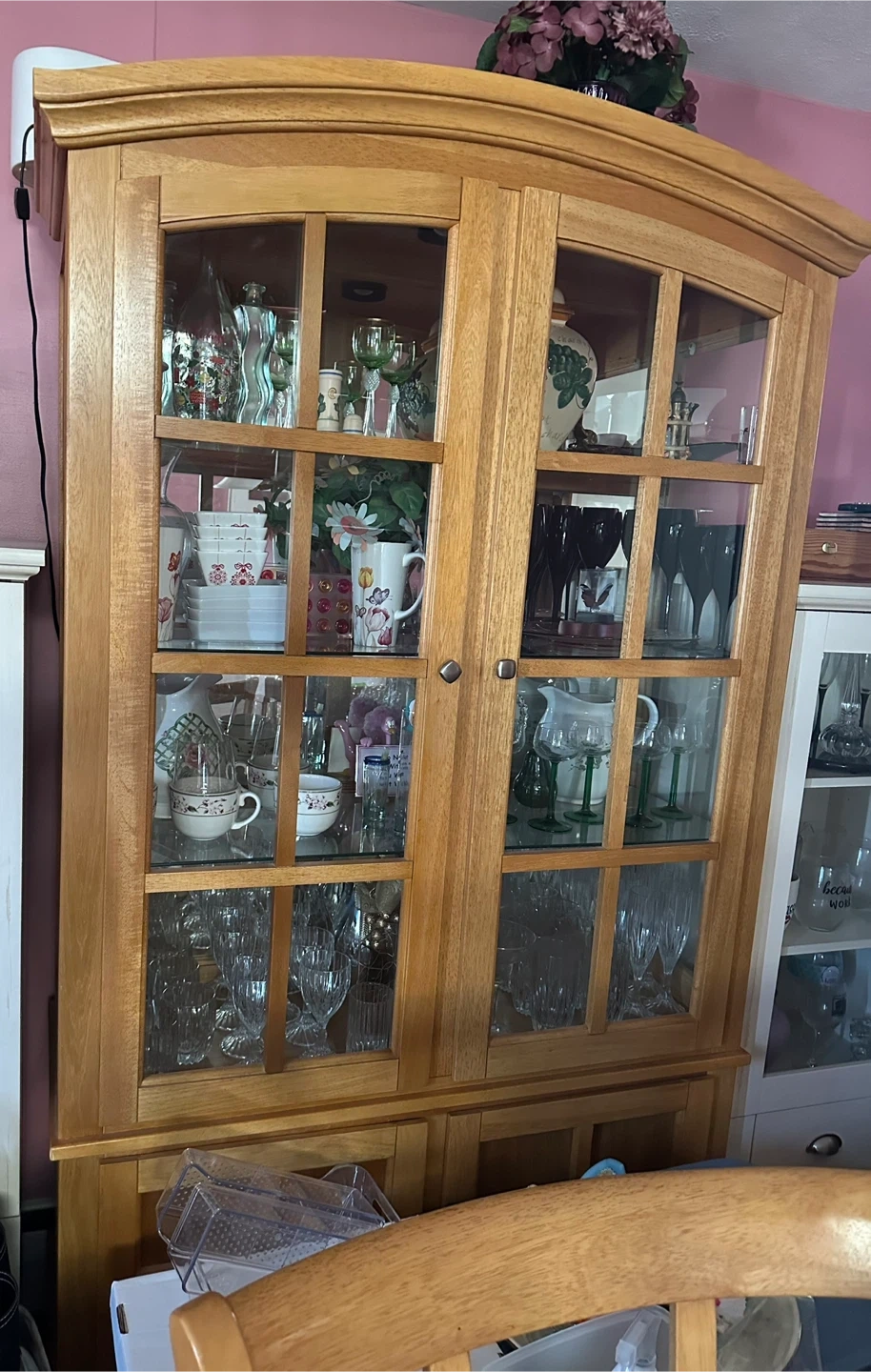 Table with leaf (please note watermark on table noted in picture); 6 upholstered chairs; 2 big china cabinets with glass doors. It’s in very good condition and has plenty of space for storage and display. Perfect for adding a touch of elegance to any dining room.
