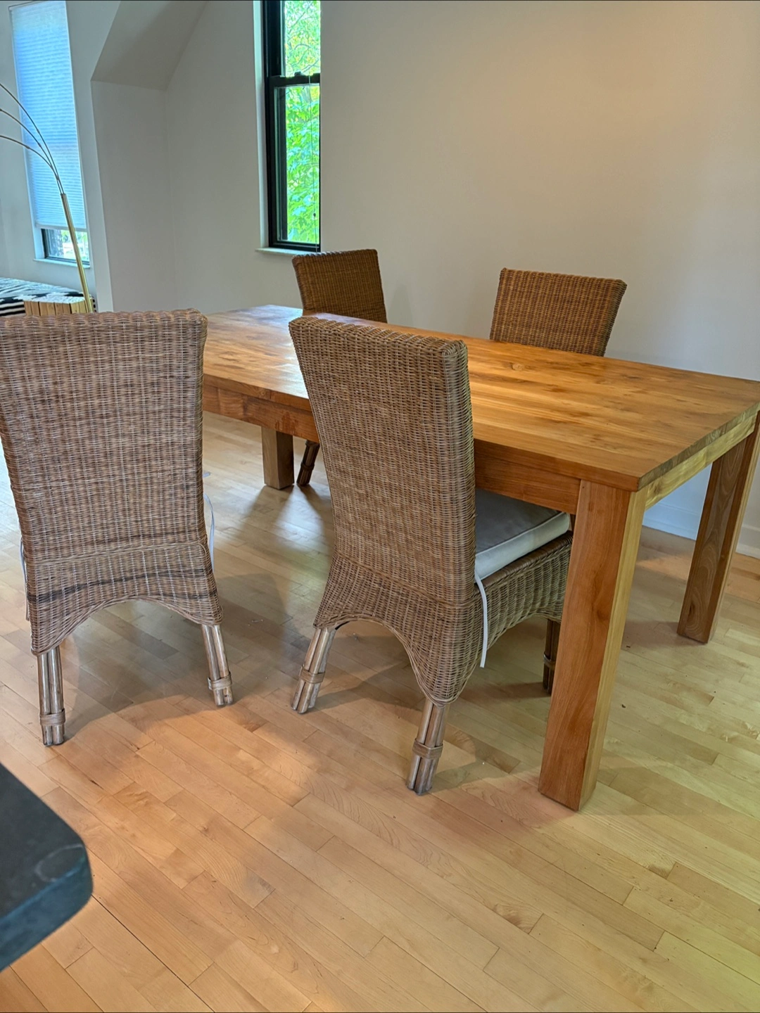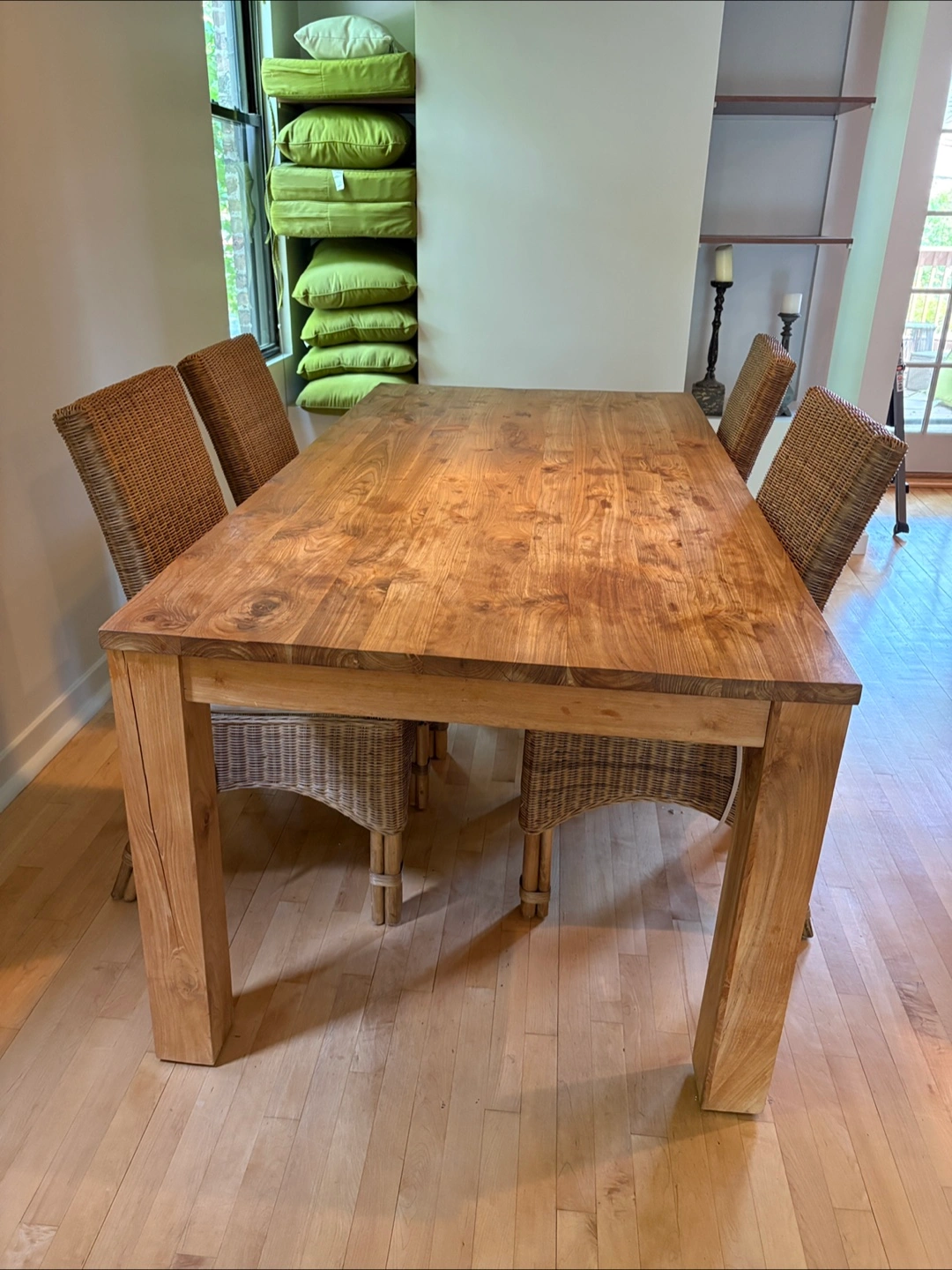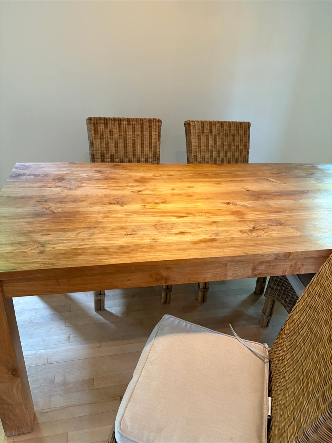 Beautiful all Wooden dining table. Features four chairs with woven backrests. Chairs have cushion seats. I hope that the set will bring you joy during meal times. Seats 6-8 Seats 6-8 solid wood