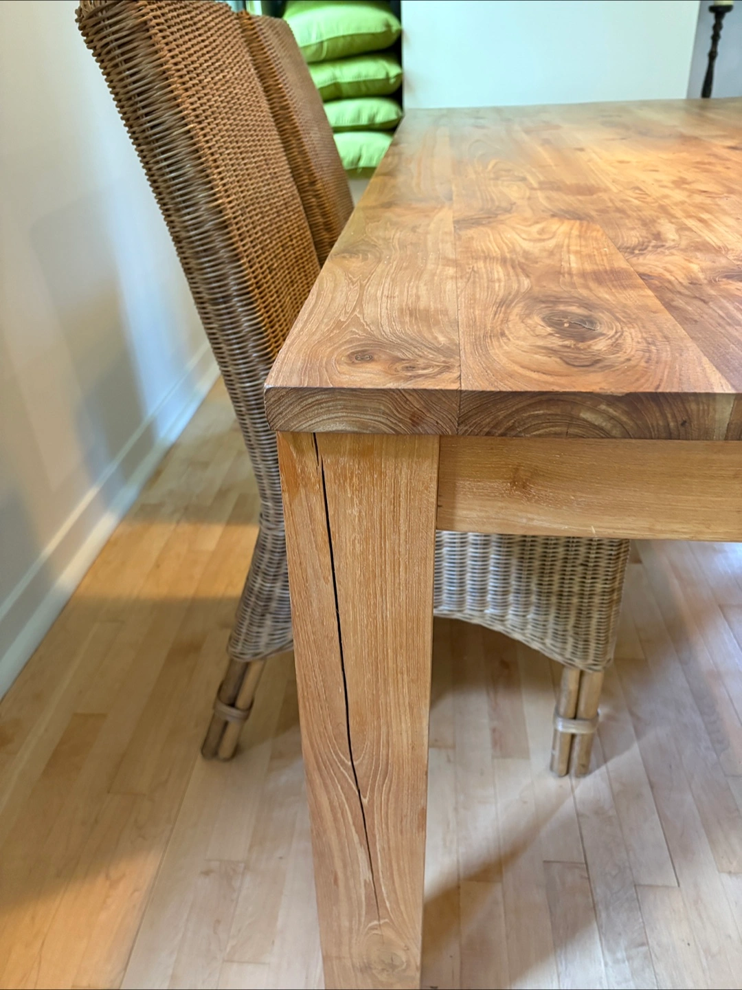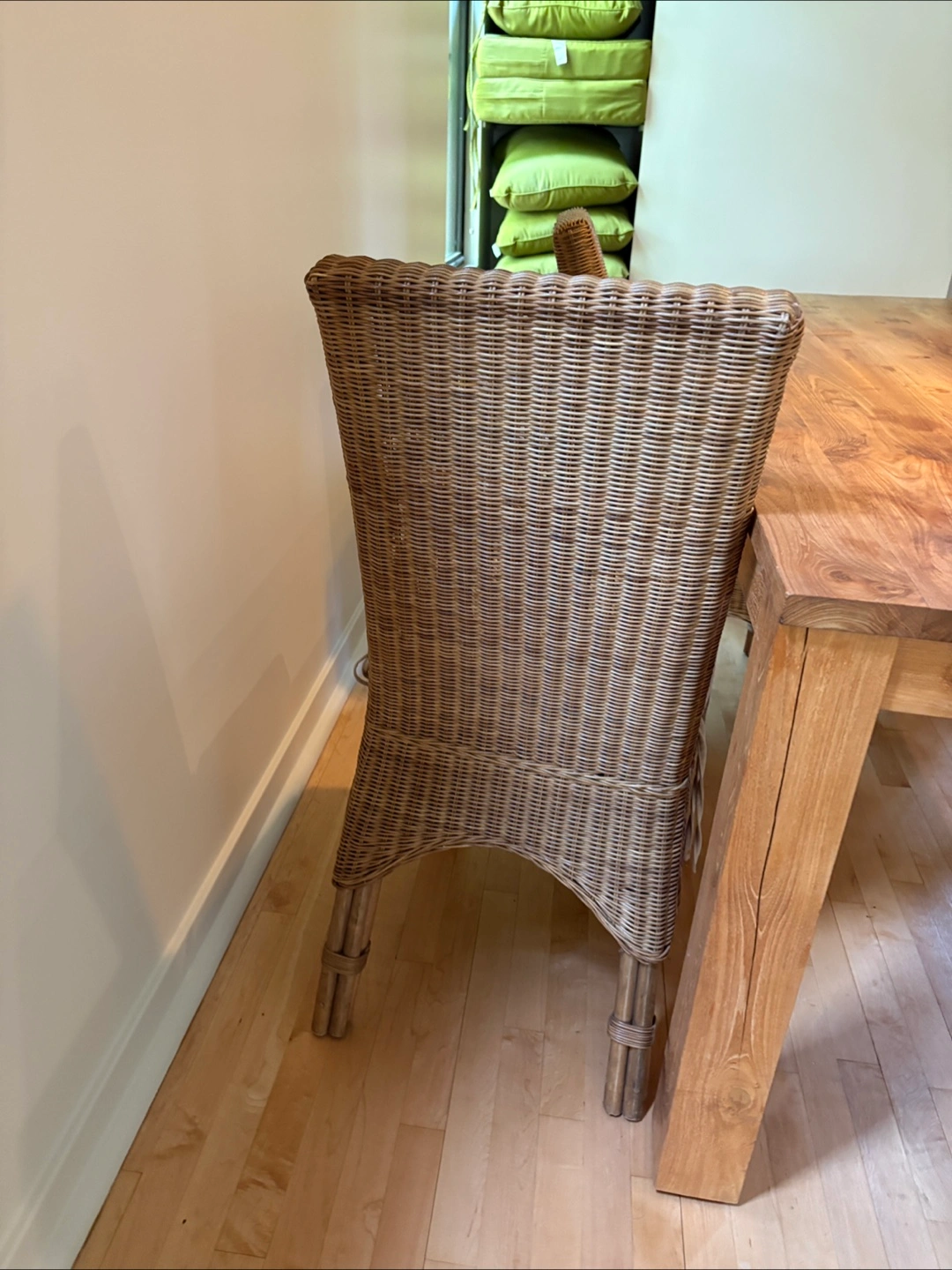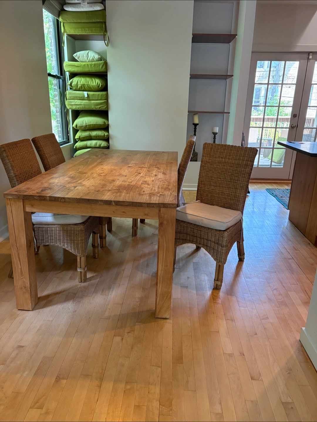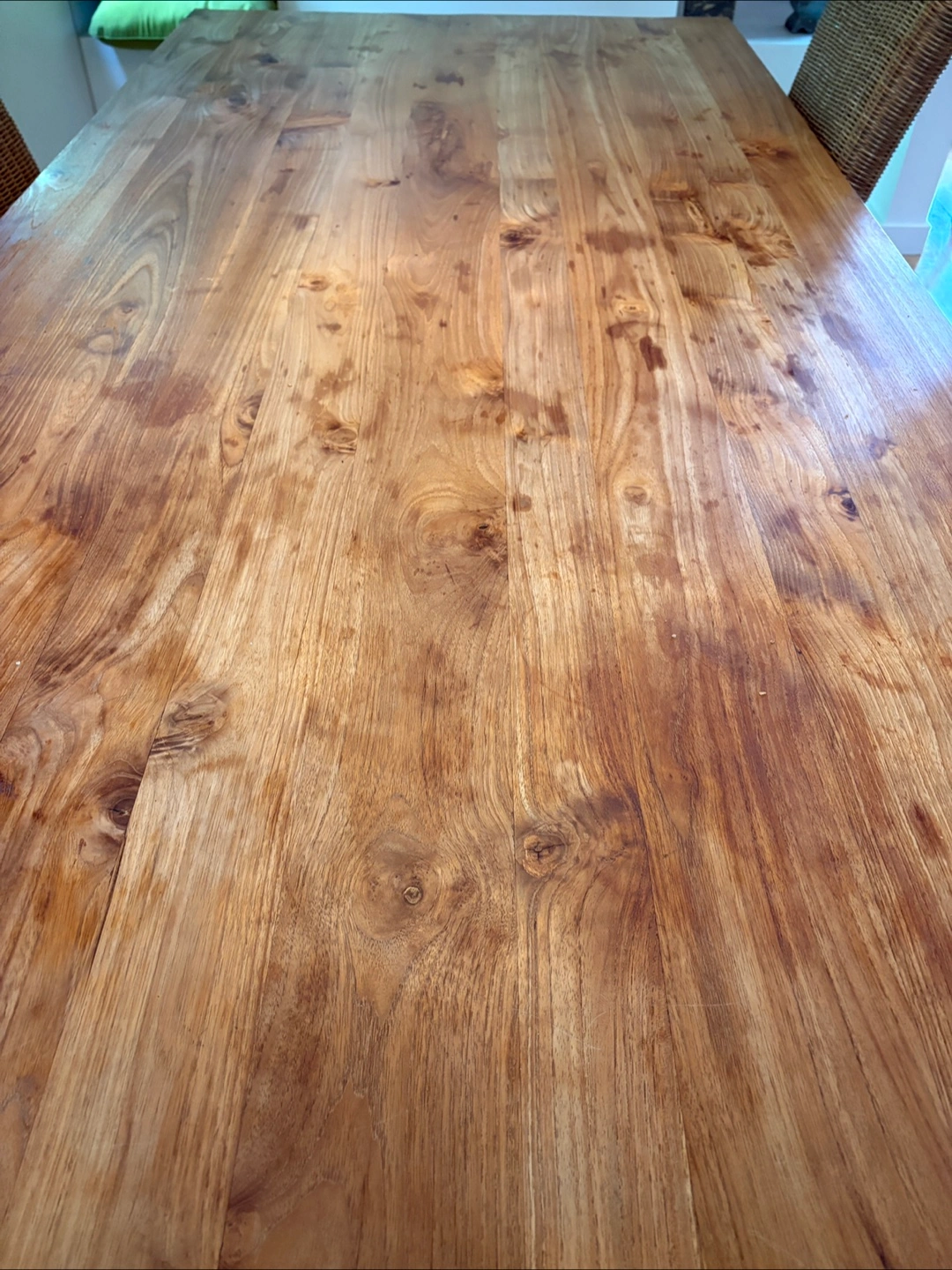 Beautiful all Wooden dining table. Features four chairs with woven backrests. Chairs have cushion seats. I hope that the set will bring you joy during meal times. Seats 6-8 Seats 6-8 solid wood