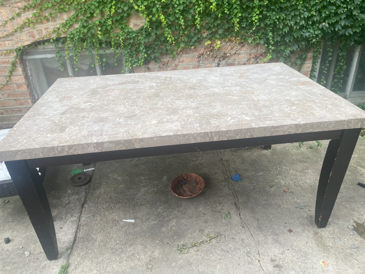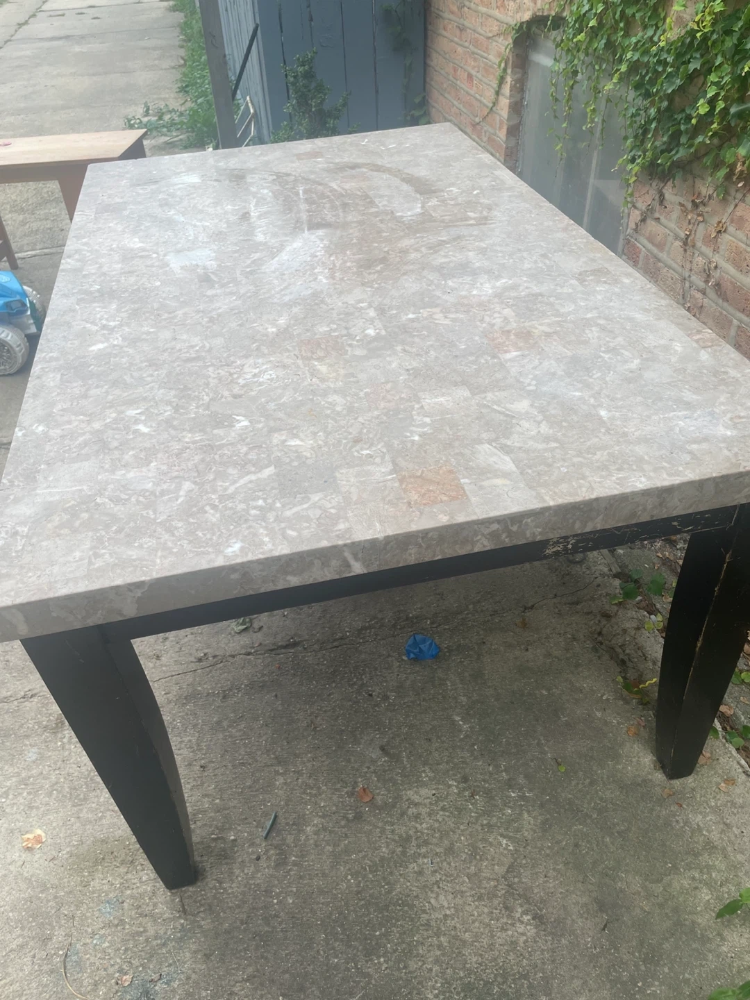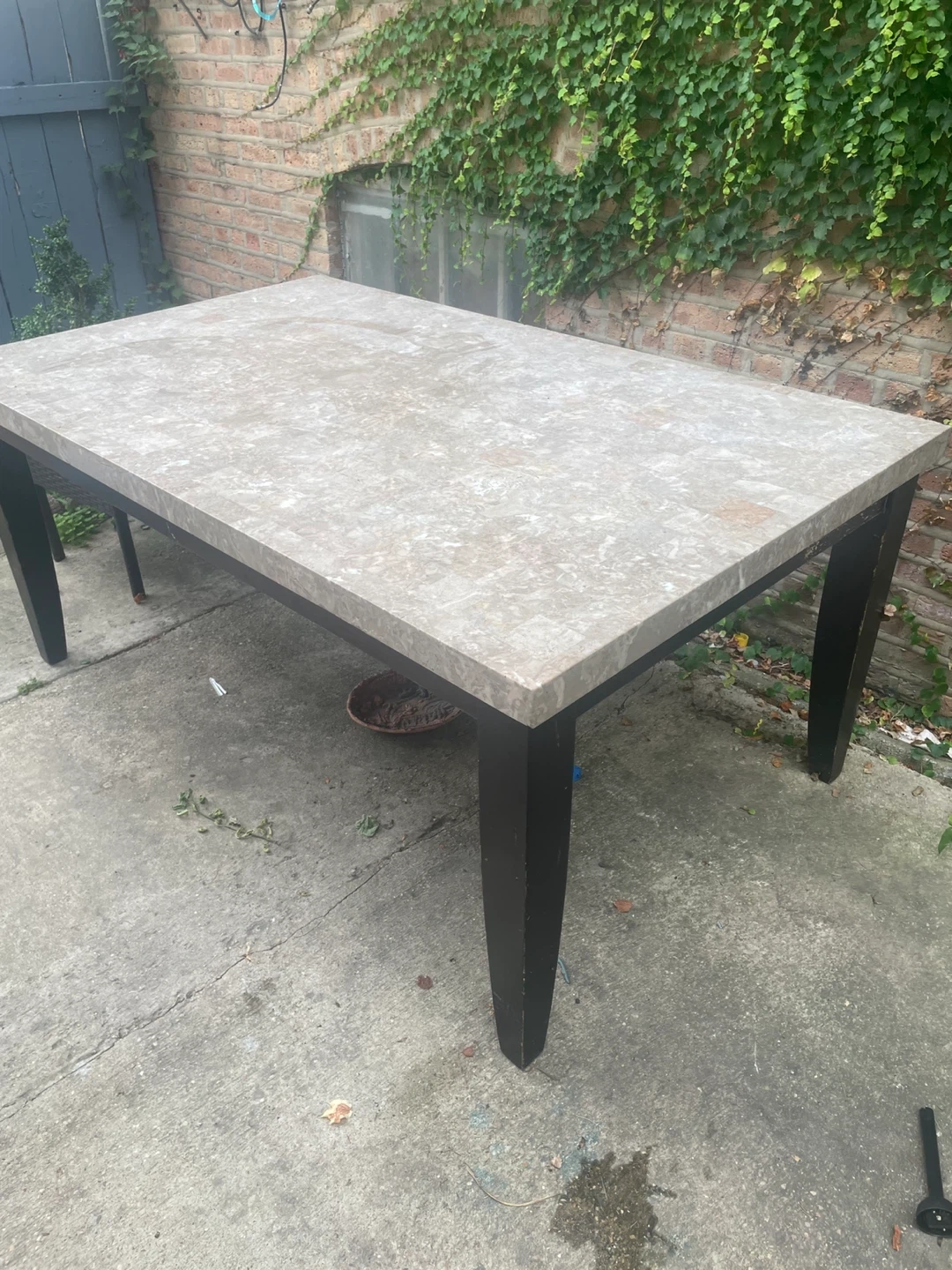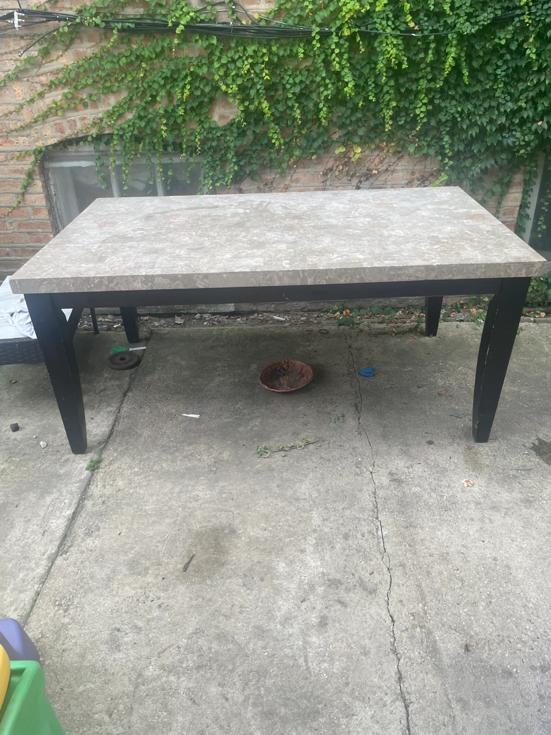 Selling a dining table with a faux marble top and dark wood legs. It's in great condition and ready for a new home! The table is sturdy and perfect for family meals or gatherings. Does not come with chairs. Very heavy. Asking for $50 obo