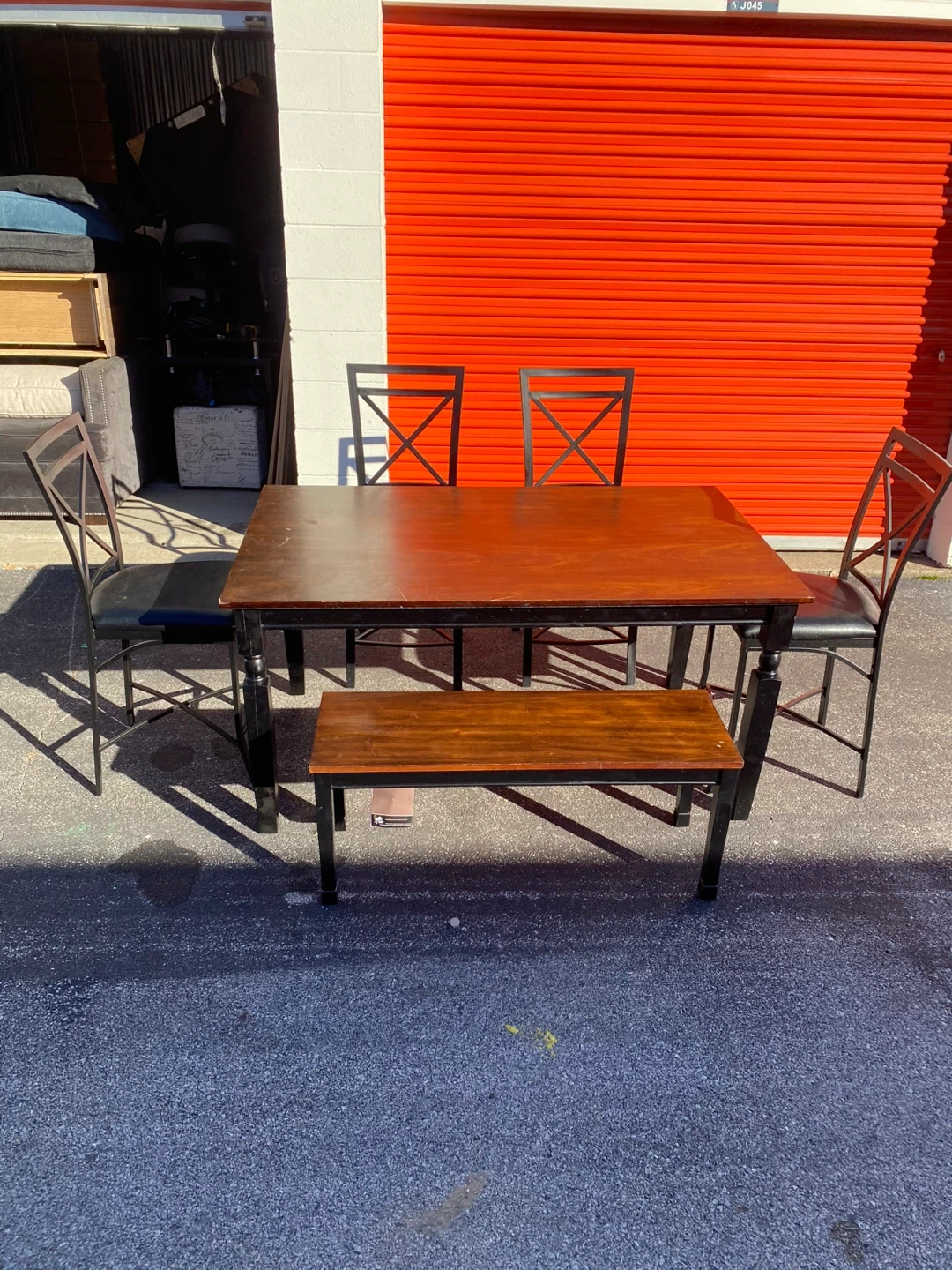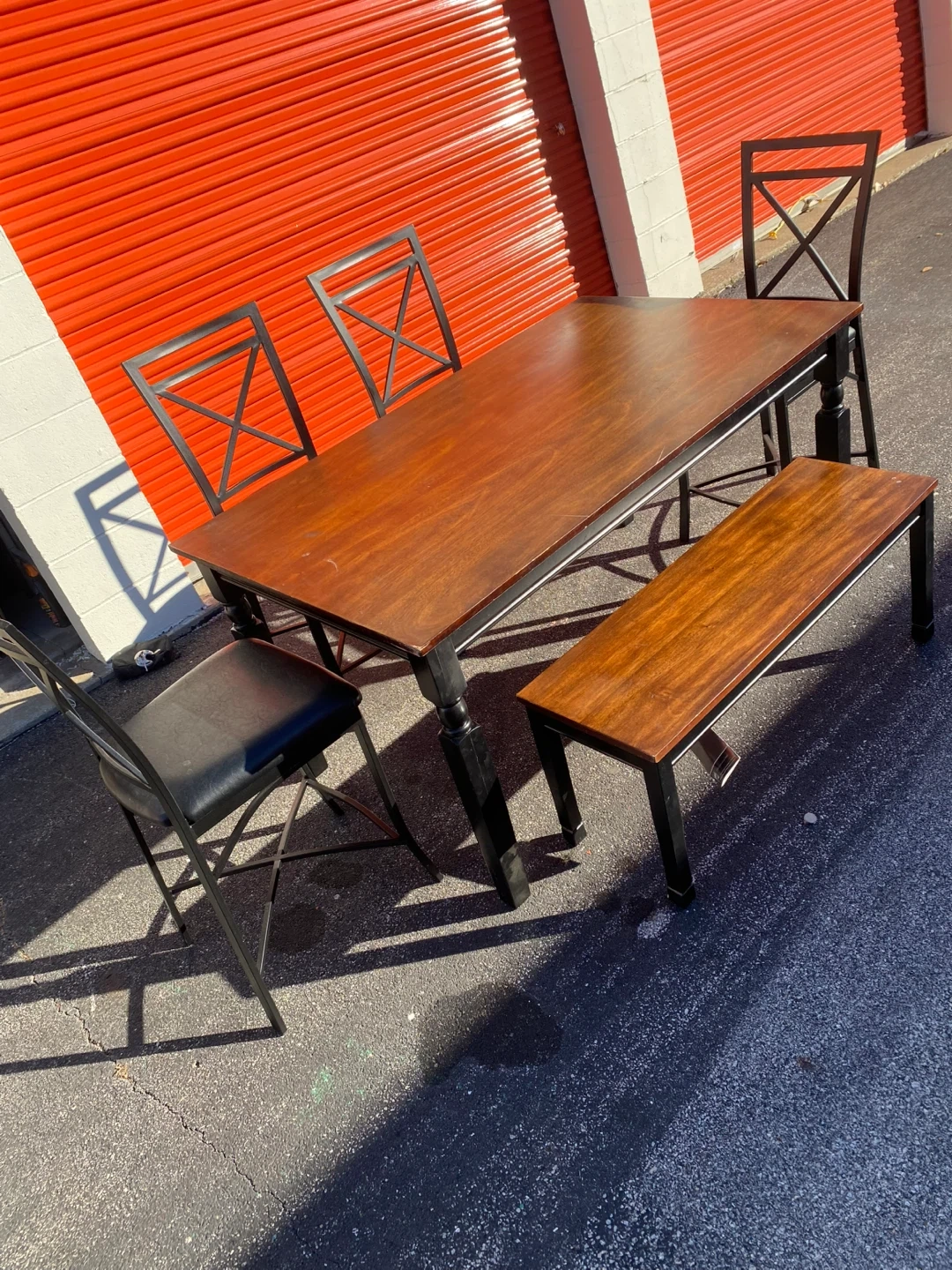65Selling a dining table set that includes four chairs and a matching bench. The table has a warm wood finish with black legs, and the chairs have a similar design with black metal frames. It's a great set for family dinners or gatherings!