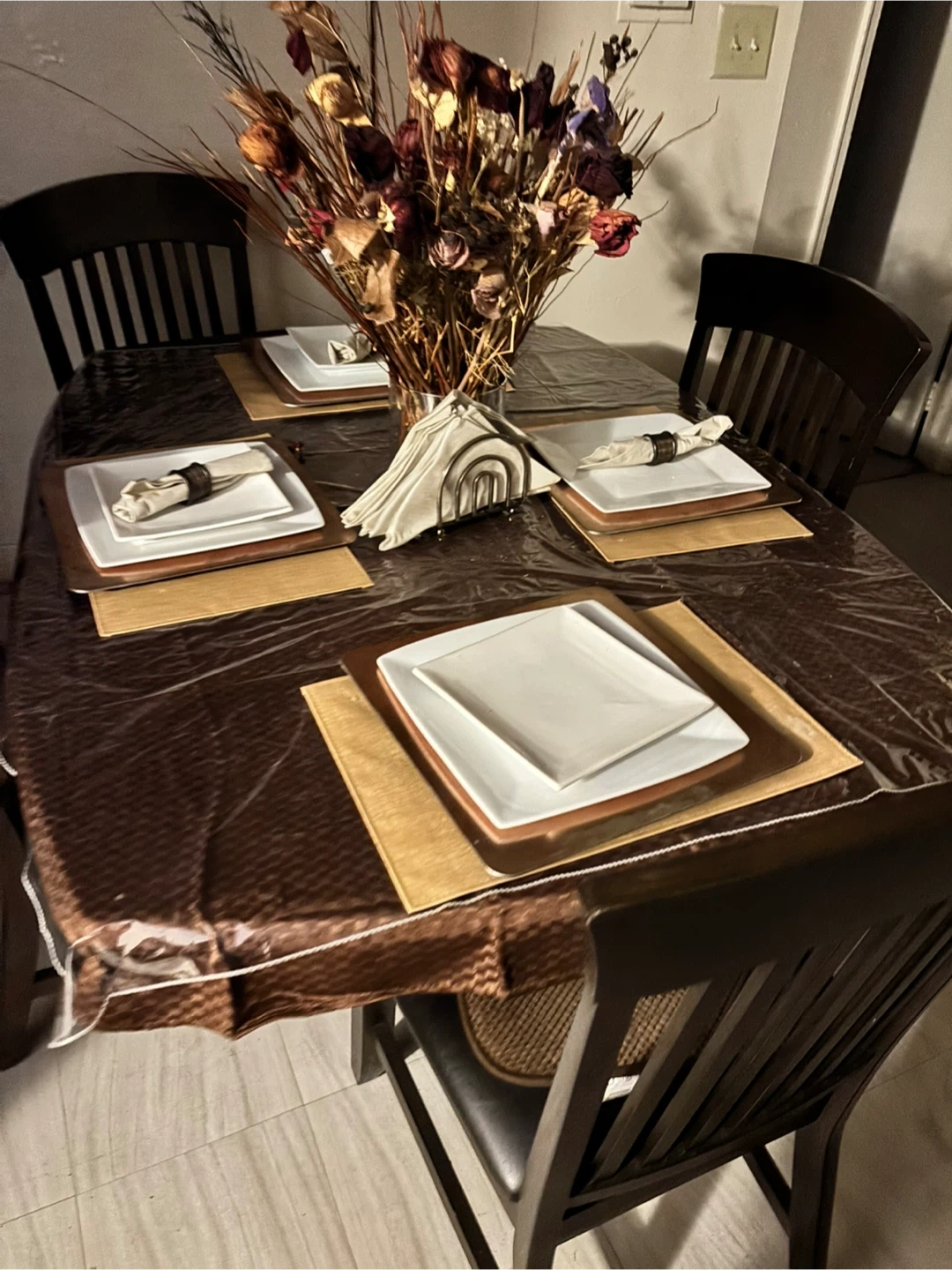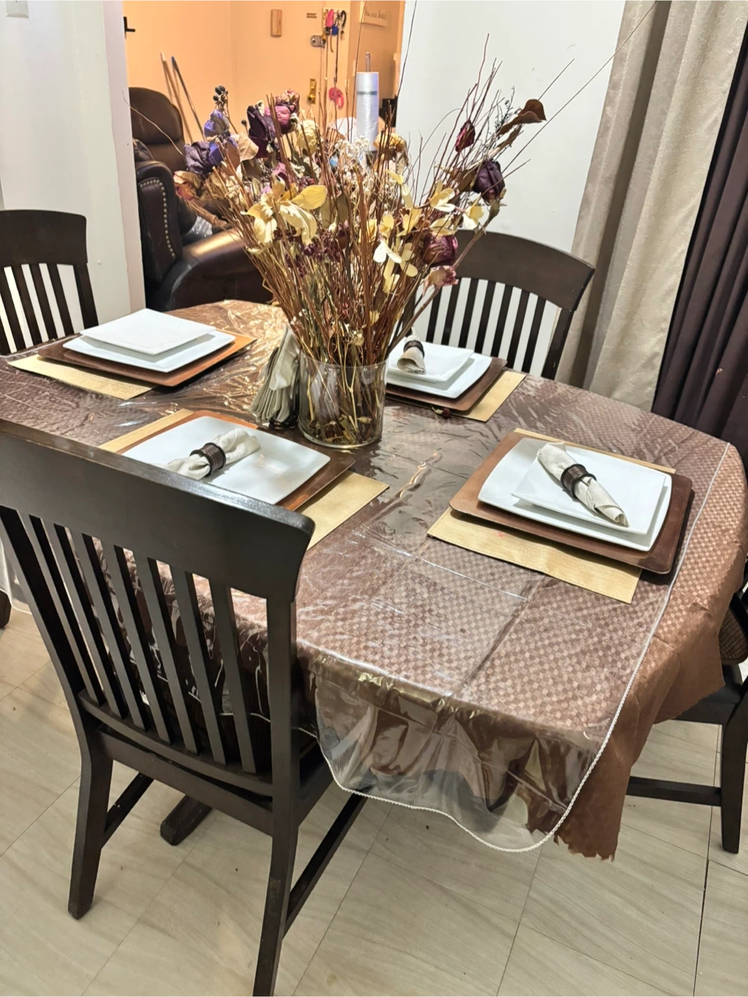 Selling a dining table set that includes four chairs. It's perfect for a small family or apartment dining area. The set is in good condition. It also can become a smaller table like a cocktail table and it’s a very strong oak table.